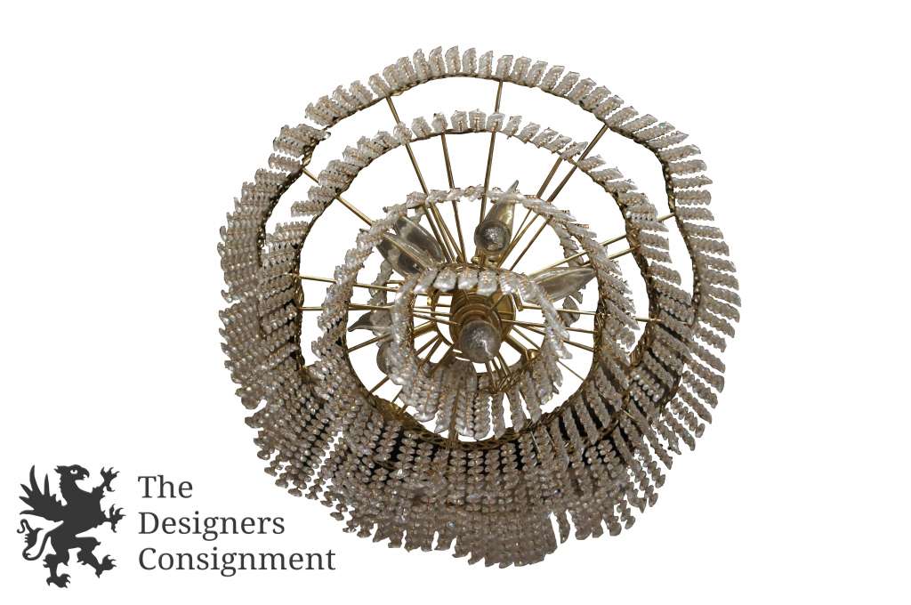 5 tier layered brass & crystal chandelier. Perfect for any setting.