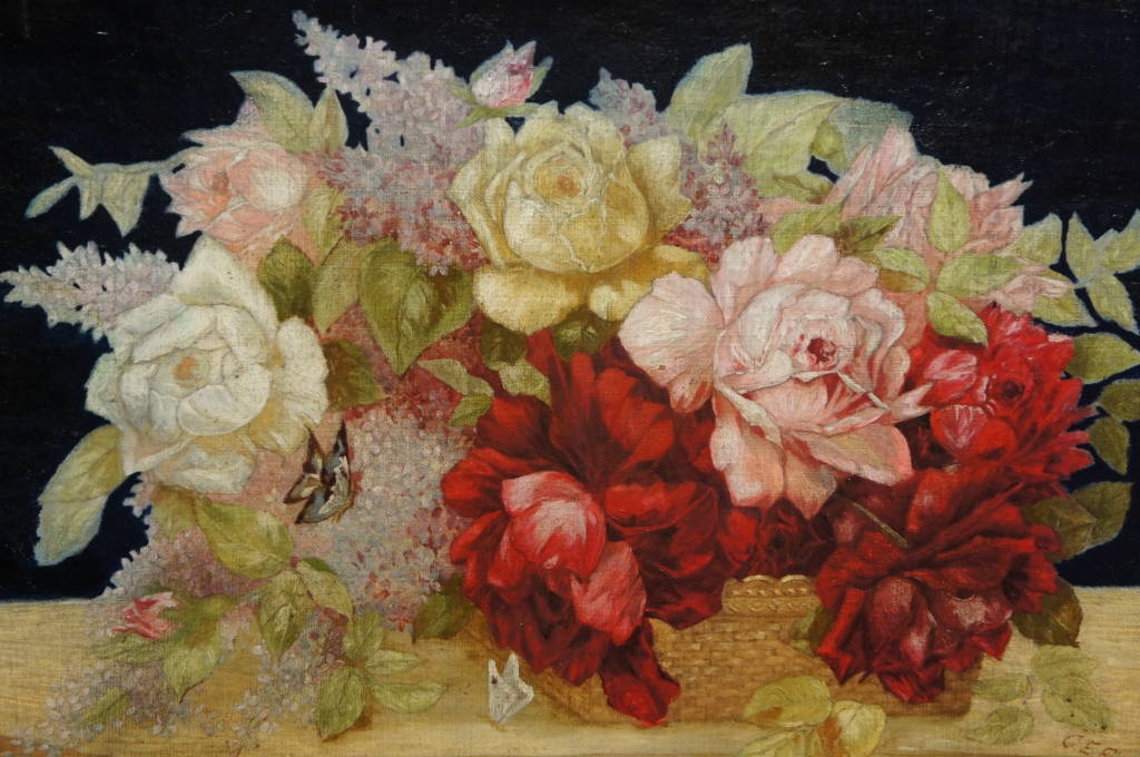 Colorful Antique Rose and Butterfly Still Life Oil By G. E. Fiorin 1898 Framed