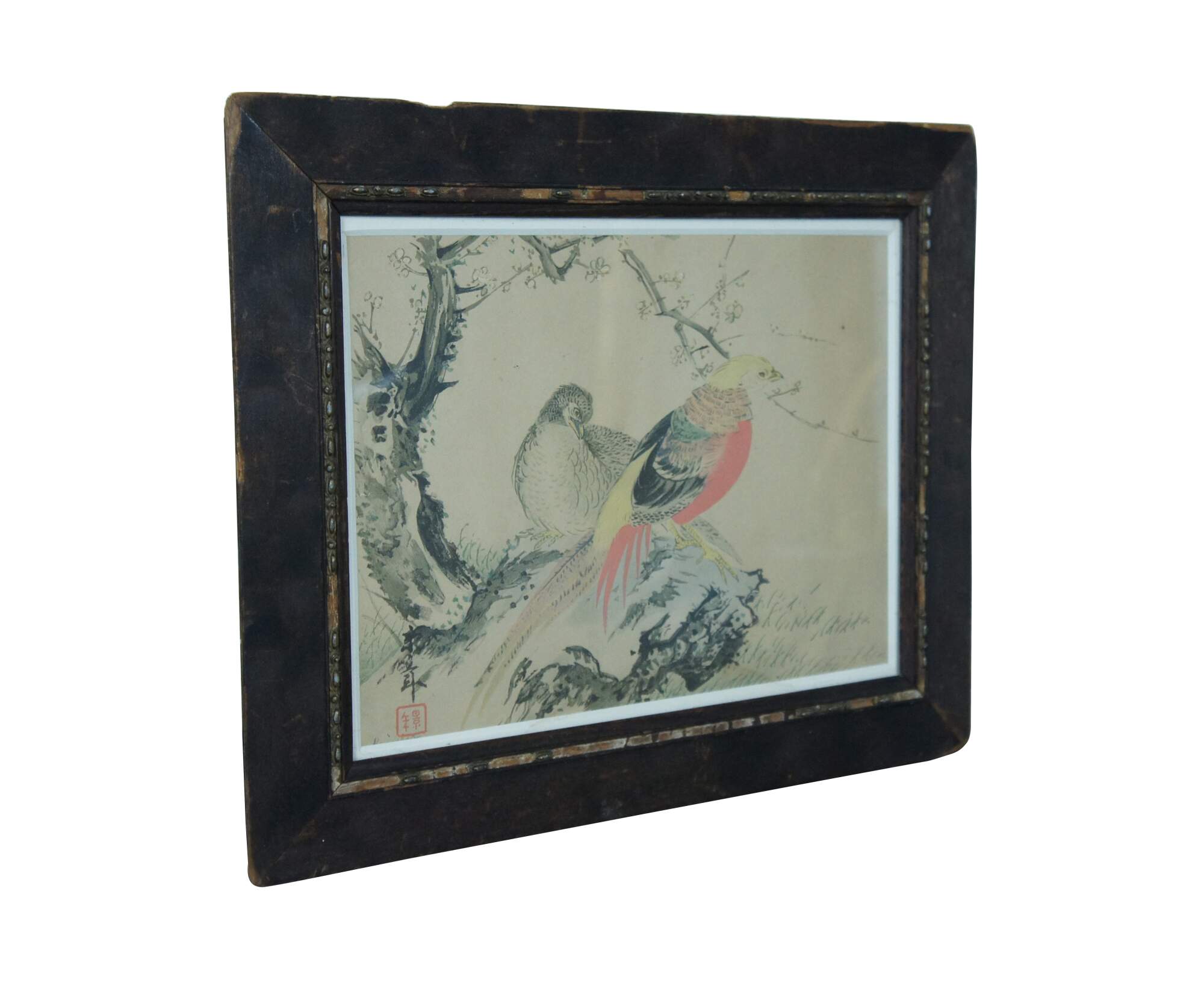 Late 19th - early 20th century Meiji period Japanese woodblock print featuring a pair of male and female Chinese Pheasants seated under a cherry tree, by Imao Keinen. Print appears to be marked or pencil signed in Latin characters under the printed seal in the lower left corner (partially obscured by mat). Plain wood frame with carved detail; white mat.