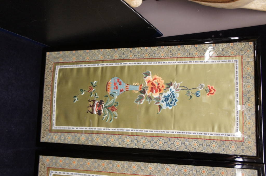 2 Mid Century Silk Embroidered Chinese Panels Custom Framed Tapestry Oriental