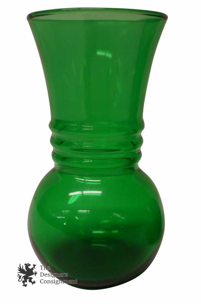 2 Vintage Green Glass Flower Bud Vases 7" Mid Century Retro Pair