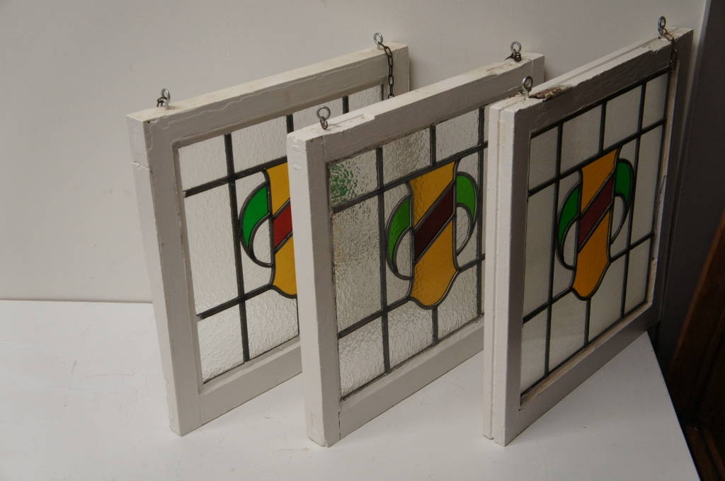 3 Antique Architectural Salvaged Leaded Plate Glass Stained Window Panels Crest
