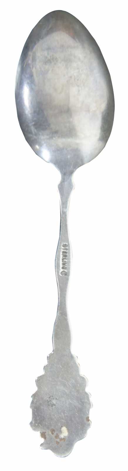 Antique sterling silver .925 spoon with engraved in the bowl Banff (Town in Alberta Canada), topped with a beaver above an enamel crest featuring a red cross and a mountain landscape. Marked sterling on backside. 5.375" and 19 grams.