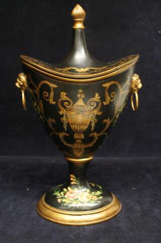 Stunning Black & Gold Painted Trophy Mantel Urn W/ Lion Knockers 18" Display
