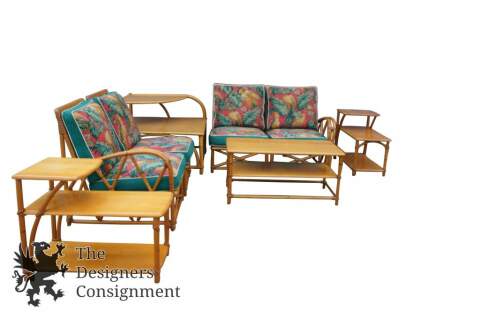 Heywood Wakefield Mid Century Modern Maple Patio Furniture Set Bamboo Sofa Table