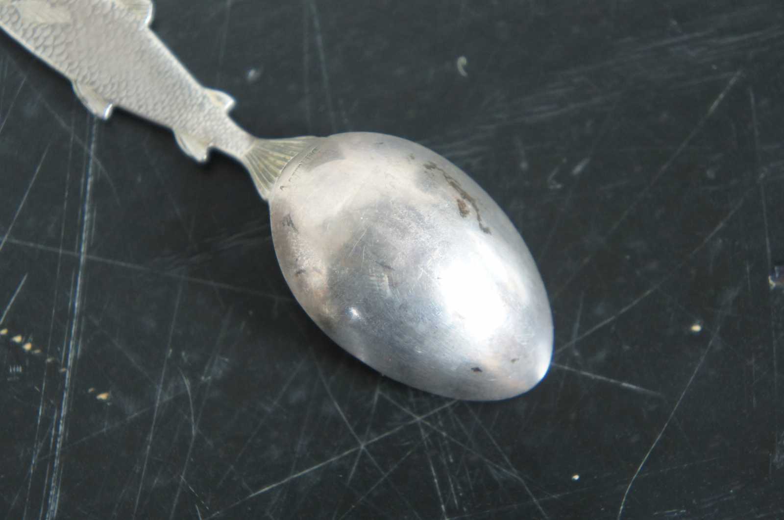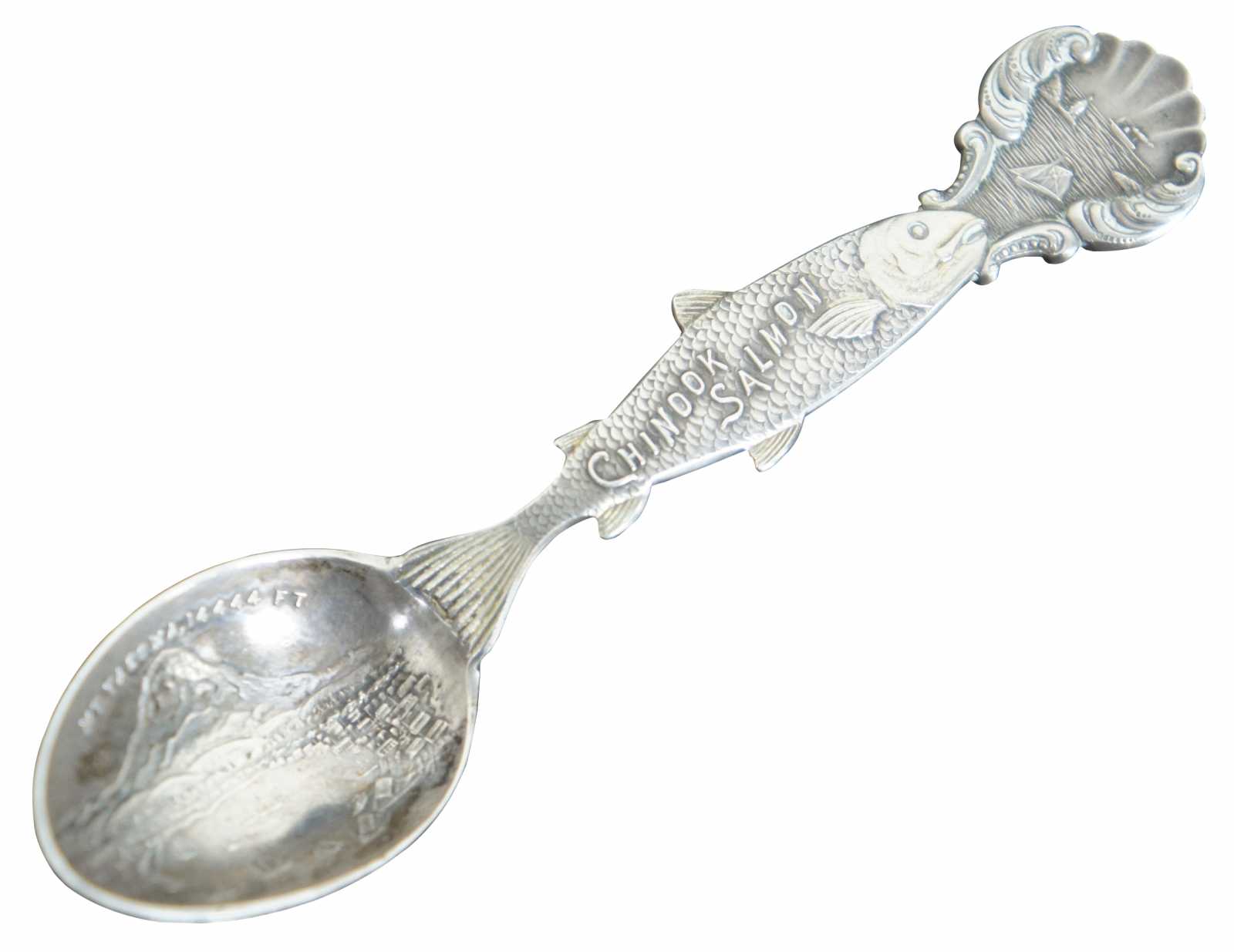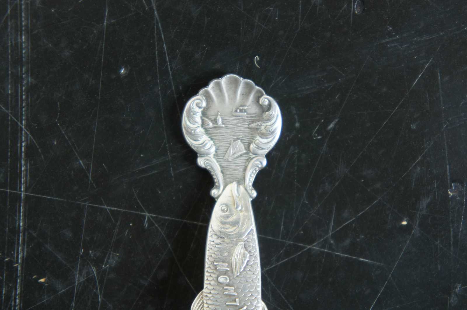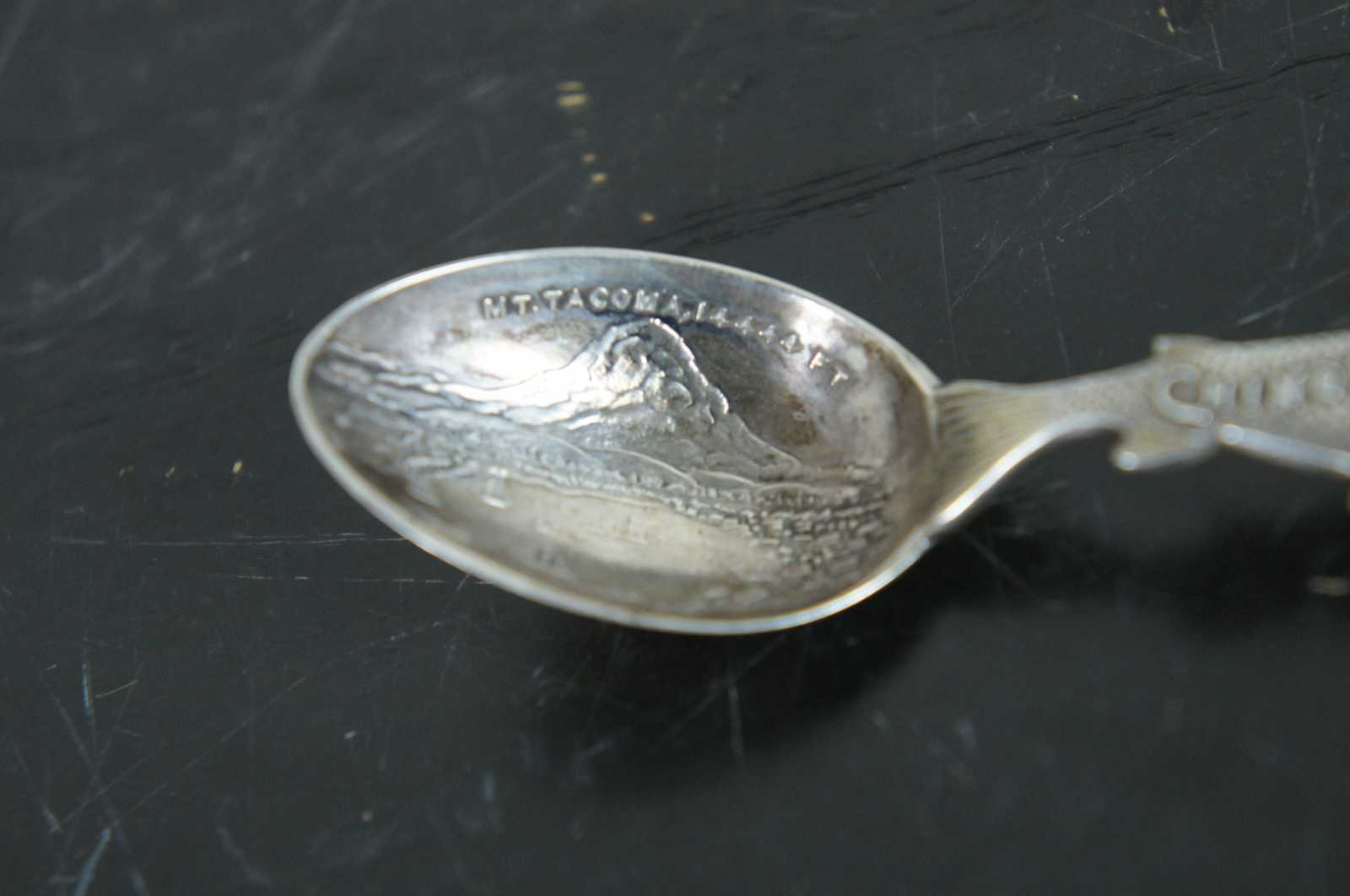 Antique Seattle, Washington, Mount Tacoma and Chinook salmon sterling silver 925 souvenir spoon. Features a veiw of the mountains and the surrounding harbour with nautical ships, structures and landscape. Marked Tacoma 14444 ft, Sterling.