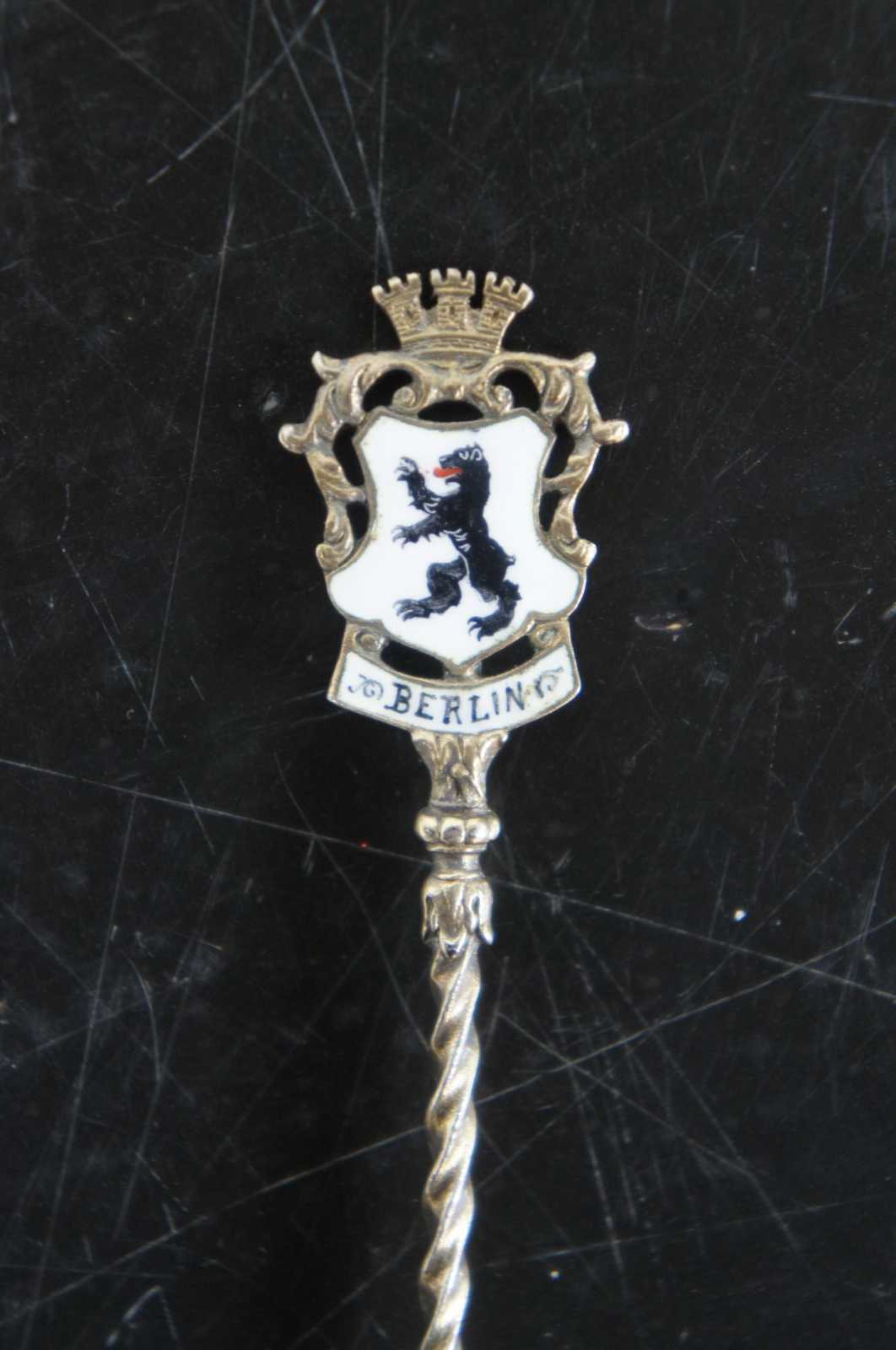 Antique .800 silver enameled German souvenir spoon, the bowl showing a view of a statue in a square with “Berlin Bismarck-Denkmal” above and a twisted handle crowned with a black bear griffon rampant.