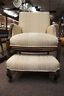 Good antique condition. The ottoman and chair have different carvings and were married at some point with the same upholstery. A foot on the ottoman was damaged at some point and repaired