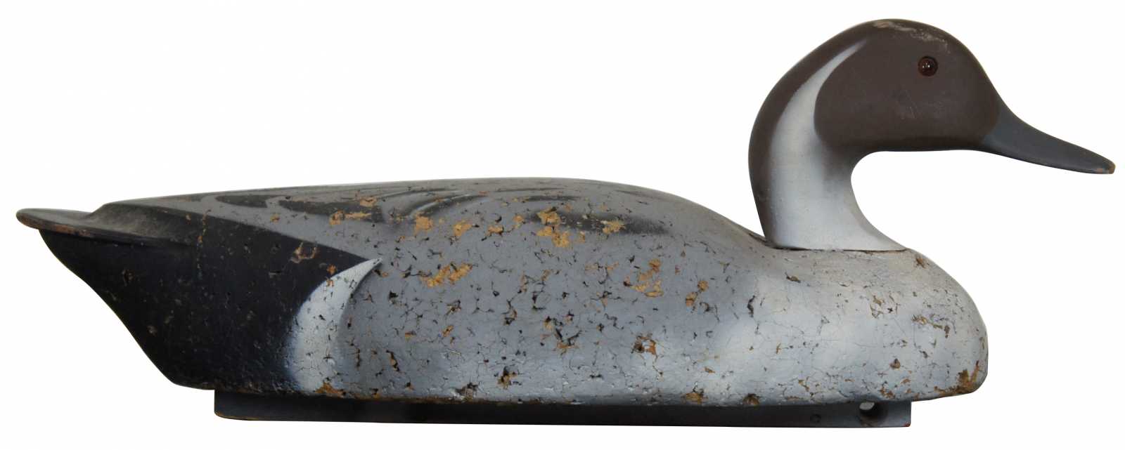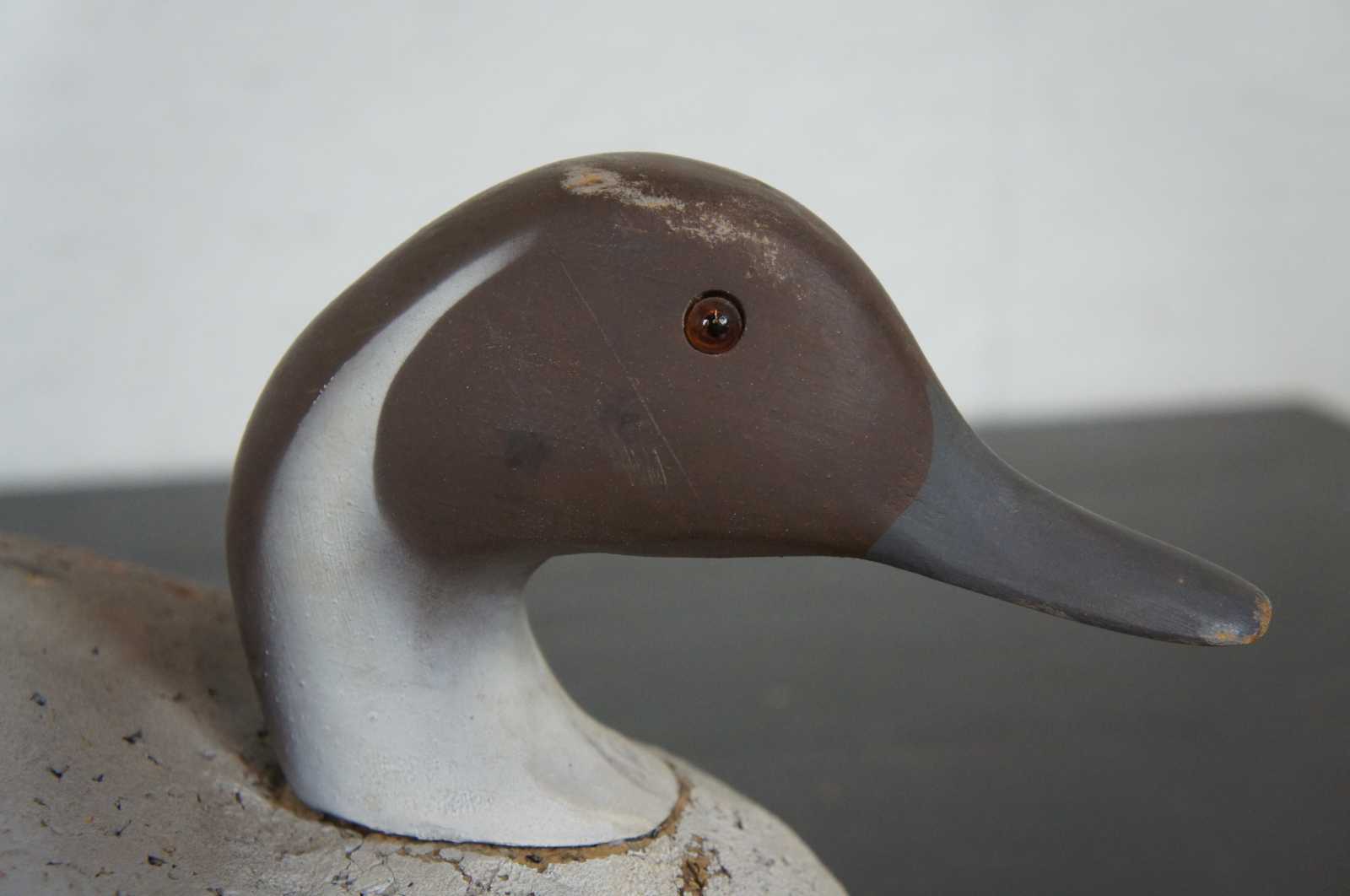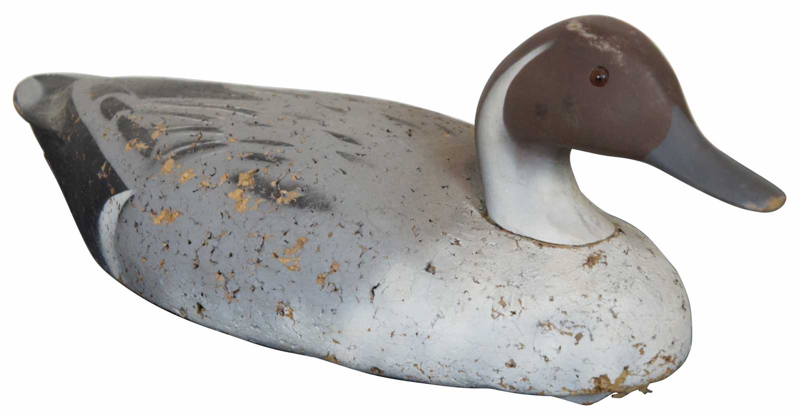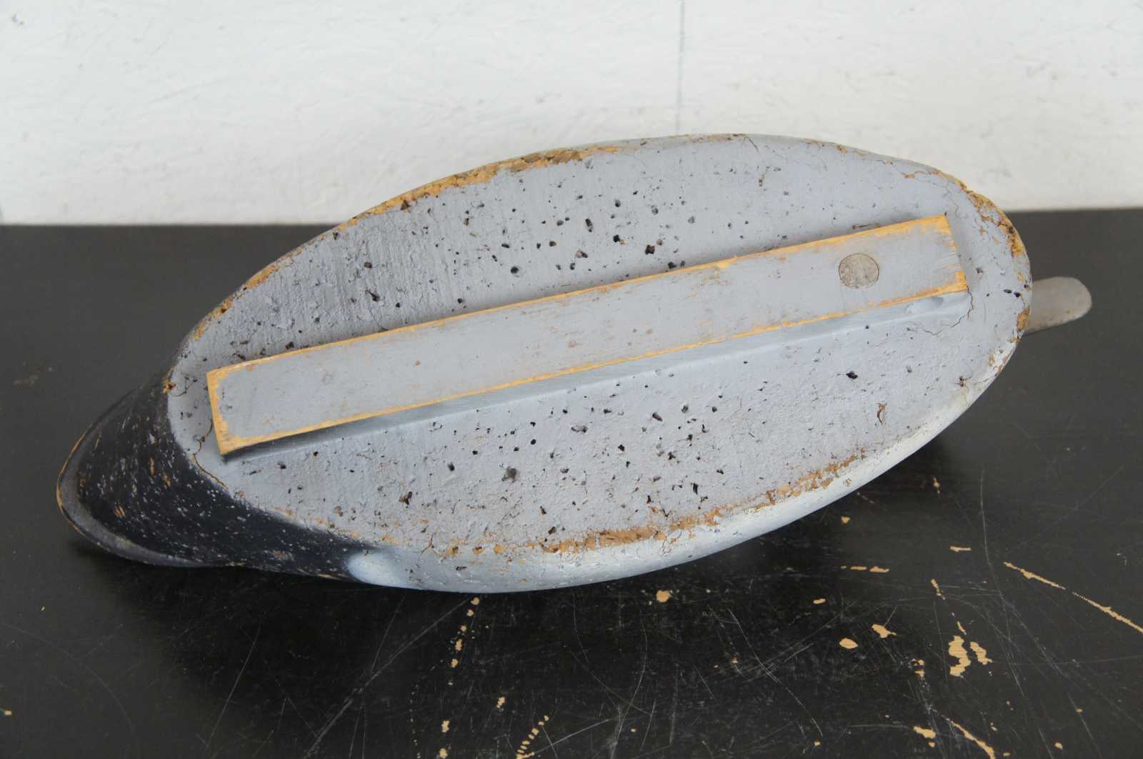 Handmade duck decoy with glass eyes and original paint. Wood head and cork body.