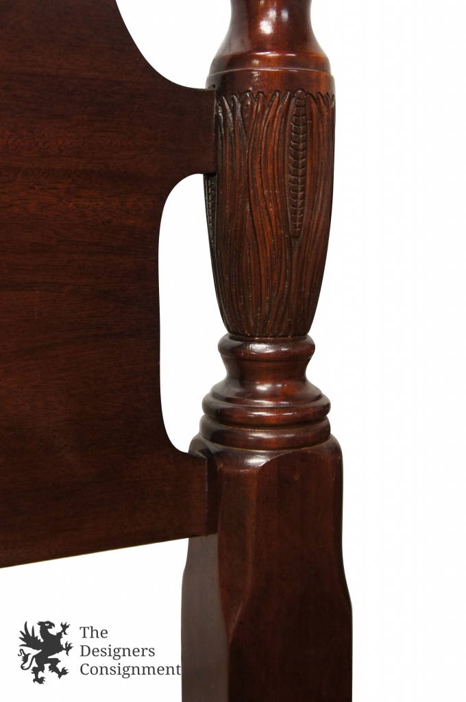 A beautiful Sheraton plantation style bed. Features 4 intricately carved mahogany post. The finials have an extender that allows them to be lowered 7 1/2" to fit in any room. This bed will be hand delivered inside your home via white glove service