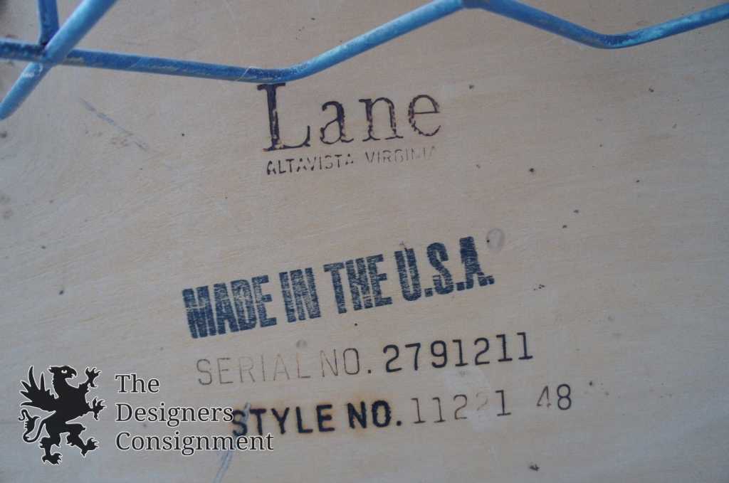 A beautifully designed piece by lane. Made on 11-21-97. Features a unique retro turquoise blue/green color with gold accents that compliments the wood nicely. The top is removable depending on your use. Will be hand delivered to your home via white glove service.
