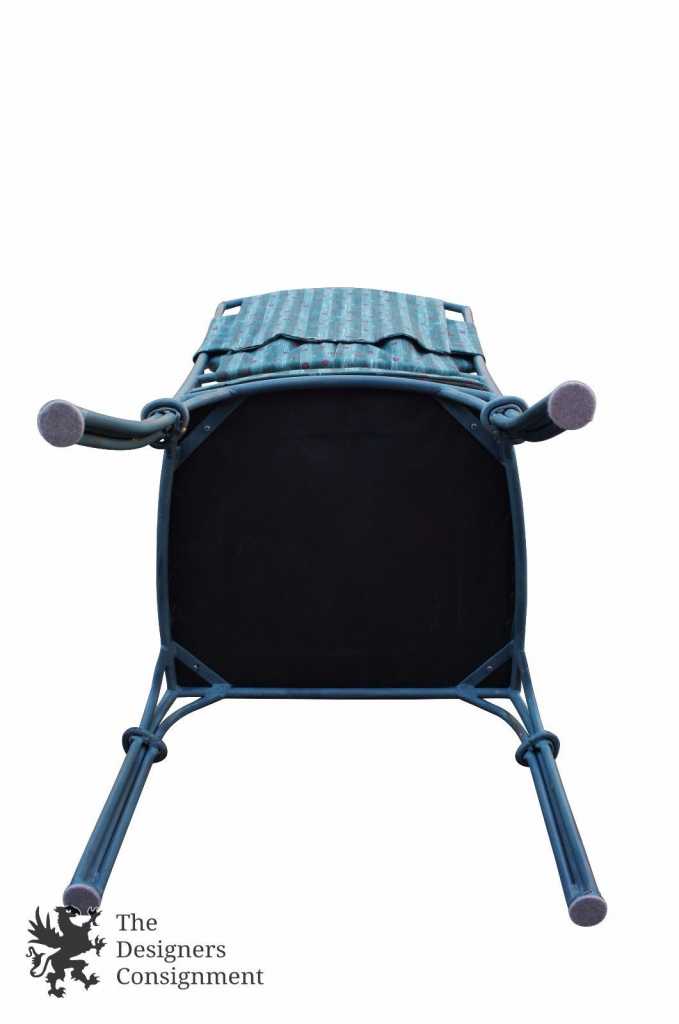 A great set of chairs for any patio or porch. Made from wrought iron with a turquoise finish. If you look closely you will see that turquoise is accented with gold distressing. Finished off with a green and red polka dot upholstery.