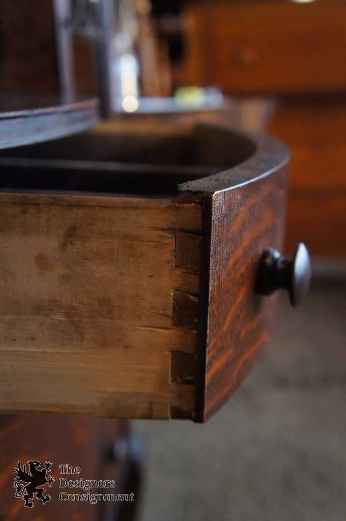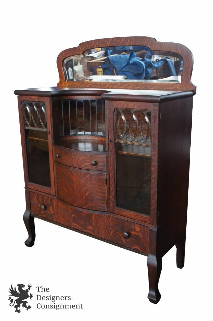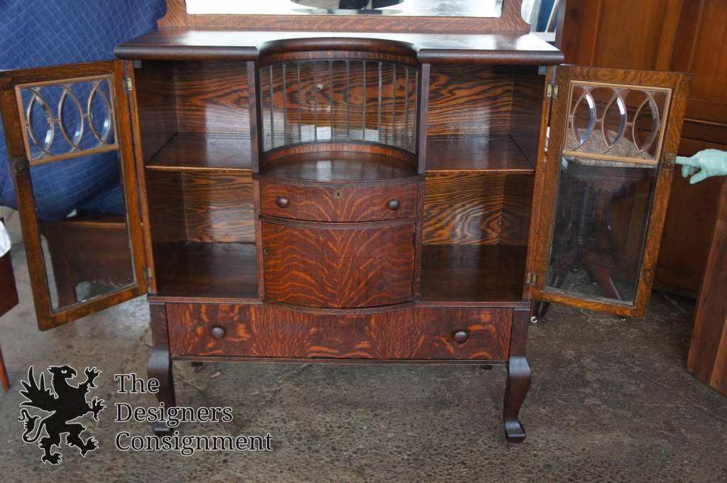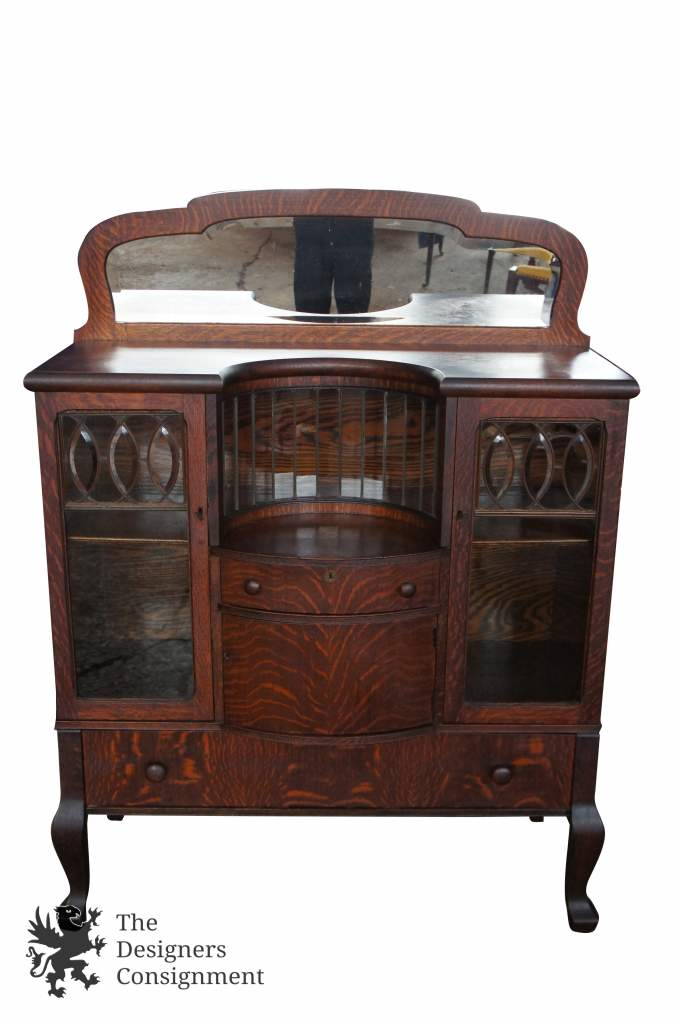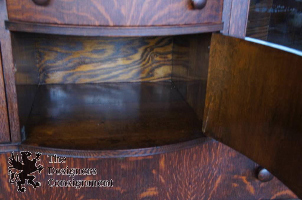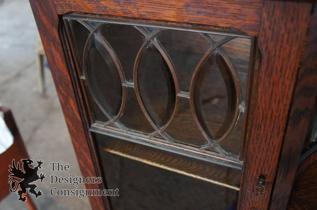 A beautifulquartersawn oak bookcase with a bow-front. Features a demilune leaded glass center panel flanked by 2 long bookcase. A felt lined center drawer, lower cabinet and casters. On the back is an originalbeveled glass mirror. Comes with 3 keys.
