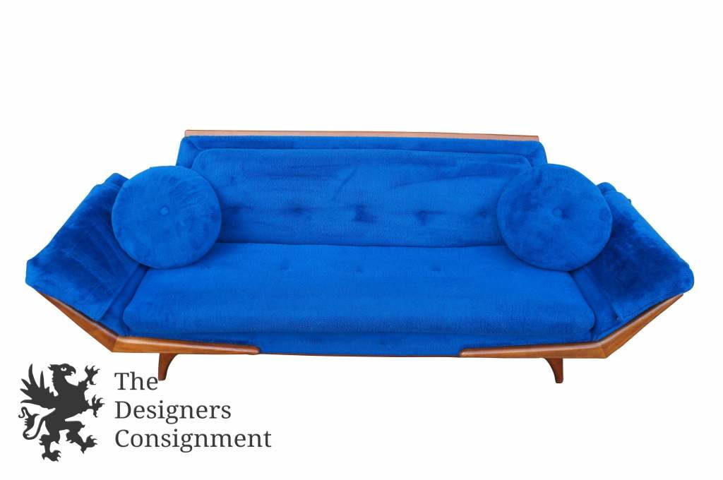 A Classic Modernist sofa by Rowe Furniture. Circa 1967. Features a blue felt upholstery, trimmed in Walnut. Matching chair and ottoman available if interested.