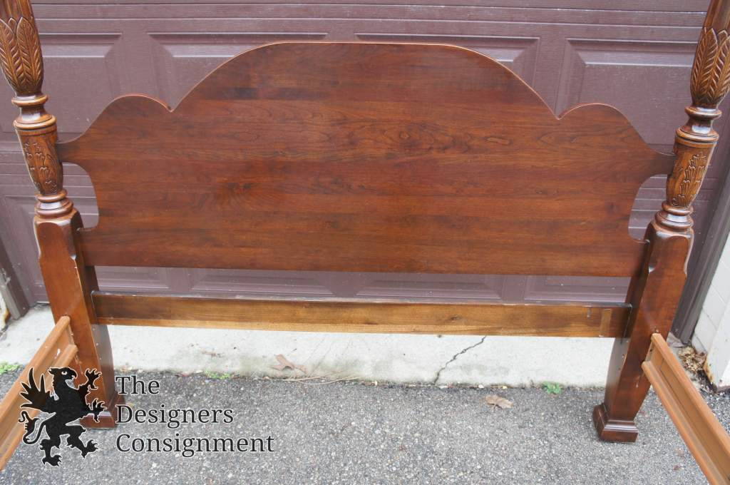 4 Poster Mahogany Queen Size Bed. Sheraton Style with Rice Carved Posts. Finials can be adjusted to fit smaller rooms.