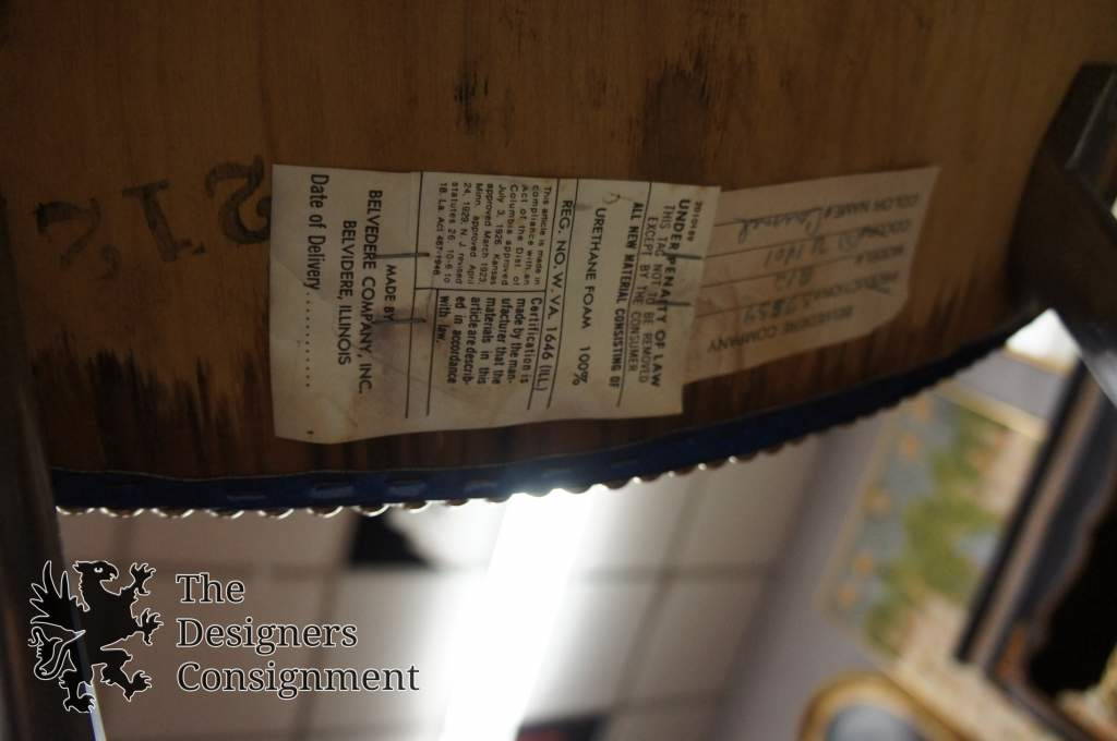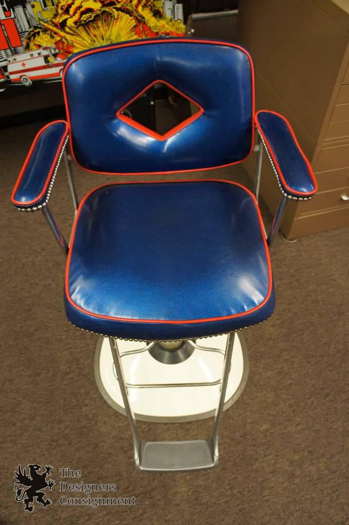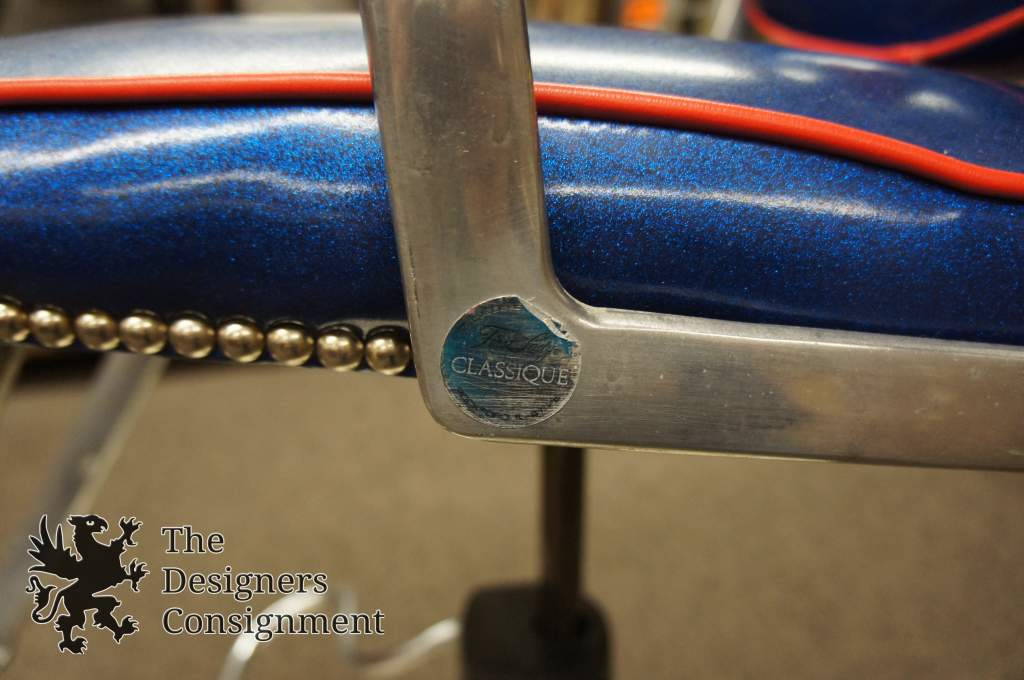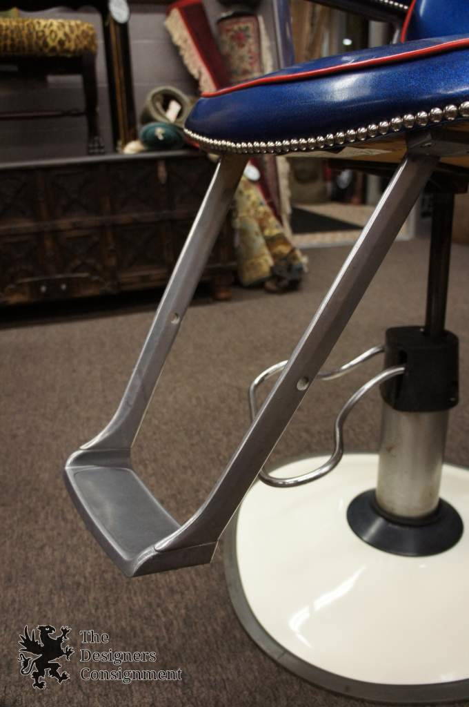 Belvedere has been providing products to the salon industry since 1927. The name comes from their location in Belvedere,Illinois. This beautiful chair features a blue vinyl upholstery with red cording and nail head trim. Finished in Aluminum andchromewith a white base. A great color combination for that college or sports themed salon.