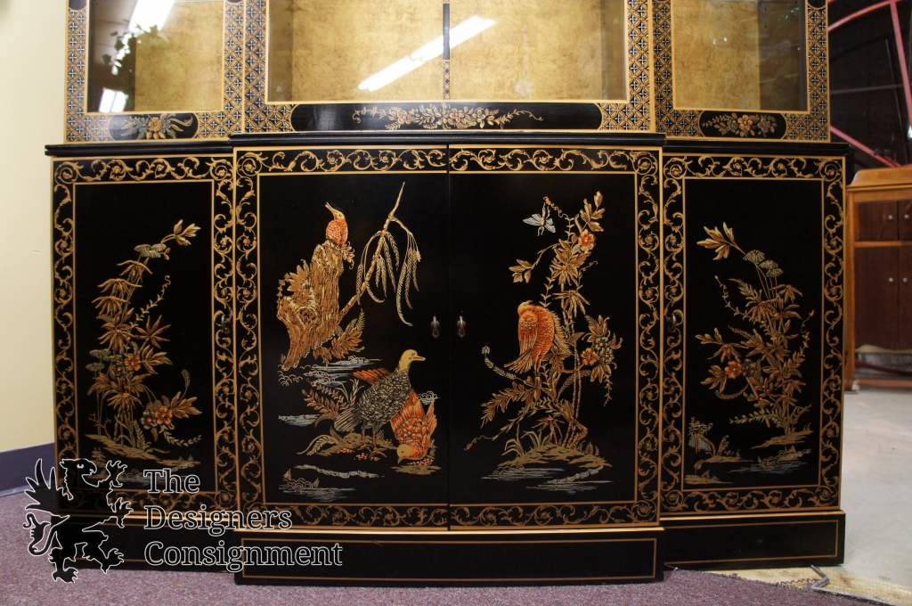 1974 Vintage china cabinet made by Drexel Heritage. From the original Et Cetera collection. Manufactured in North Carolina. Features a Chinoiserie styling with black and gold motifs. A great addition to any setting.