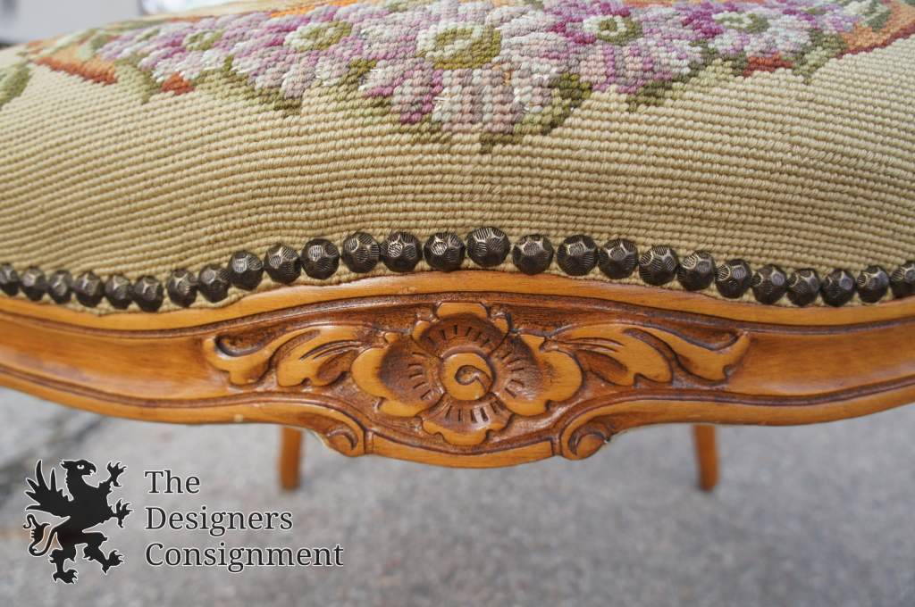 The perfect needlepoint covered arm chair. Carved Walnut with floral accents
