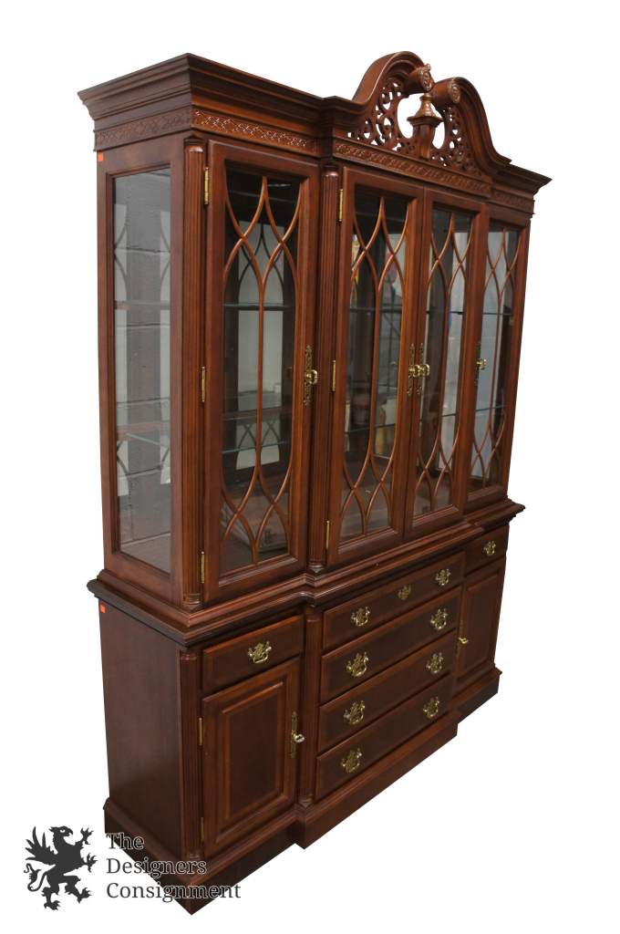 A beautiful looking breakfront with plenty of room for storage. Classic Queen Anne styling with a distressed Mahogany finish. An open Pediment crown aligns an illuminated top. The glass doors are coveredin intricatefretwork. A great addition to any setting!