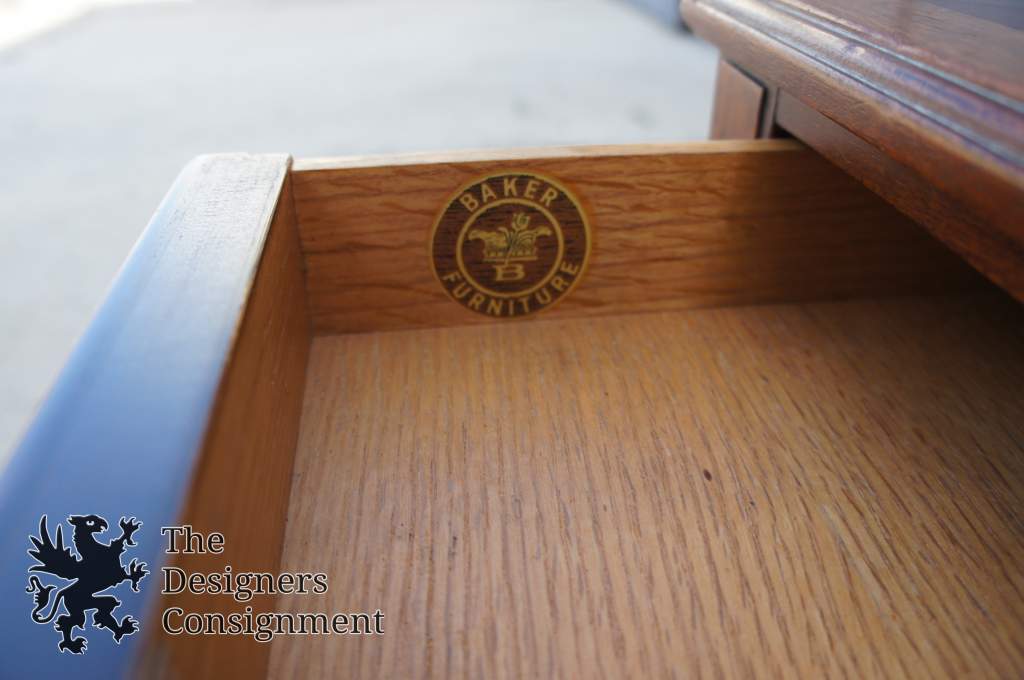 A stunning piece of furniture from Baker. Features their 1940s era Logo. Made from distressed Mahogany with a parquetry finish on top. There is a drawer along the front, and 2 pullout trays on the side. Perfect for cocktail party'sand games. Will be Hand Delivered via White Glove Service.