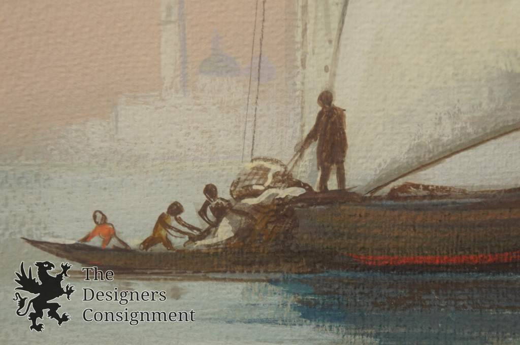 A stunning signed watercolor of Venice, Italy. Appears to be signed by E. Lov, however it could be a Low. The piece depicts a sailboat and gondola in the ocean on a beautiful day.