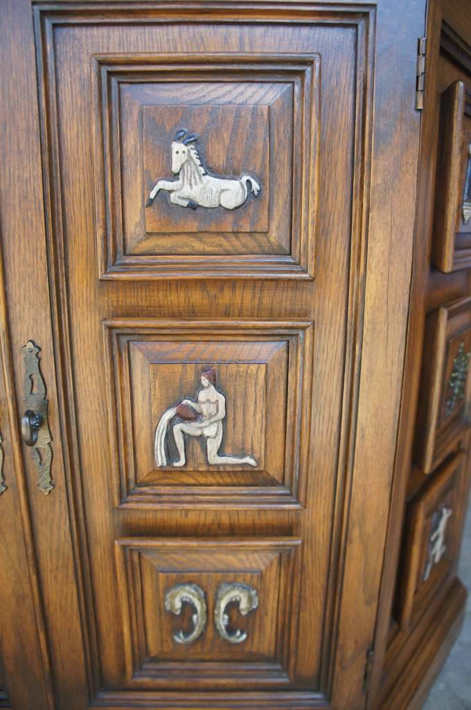 A rare find from Romweber's Viking Oak 'Zodiac' Collection. Made in Batesville, Indiana. Features polychromed relief and carving with a adjustable shelved interior.