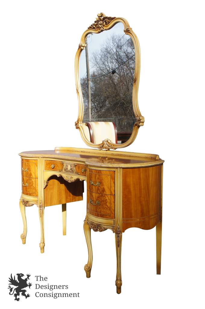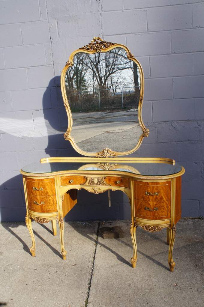 A stunning vanity/ makeup table by Fridman Furniture Company out of CincinnatiOhio. Made from Maple with beautifully carved accents. The mirror which is matching has a bar fitment that allows it to sit on top of the piece without being mounted to the wall. This could be removed if you would rather have it hanging on the wall. The vanity comes with a custom fitted mirrored glass top.