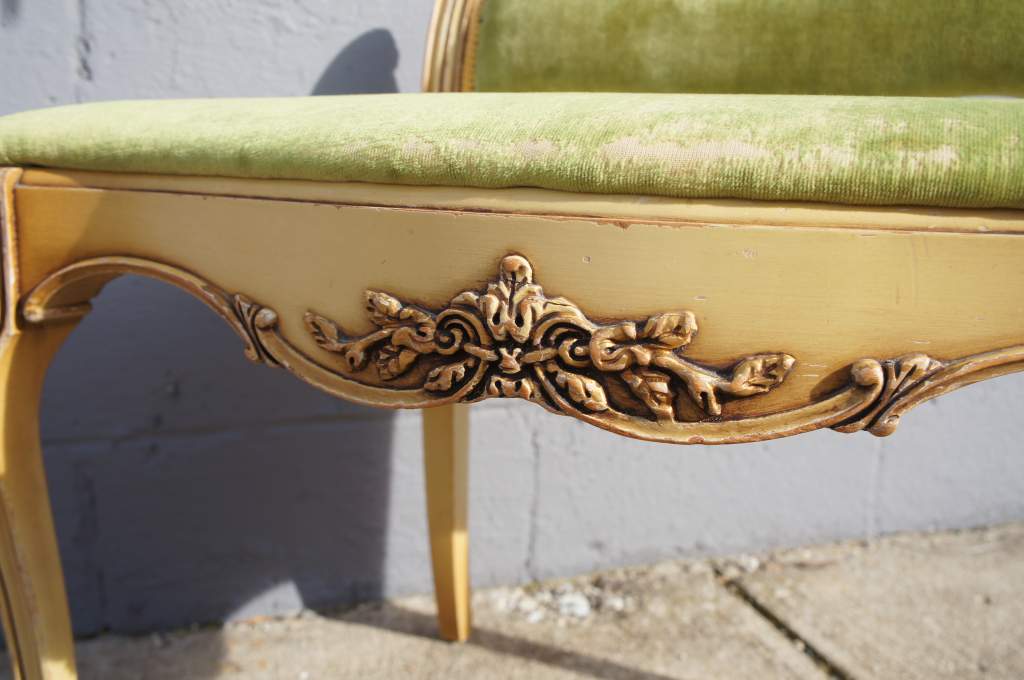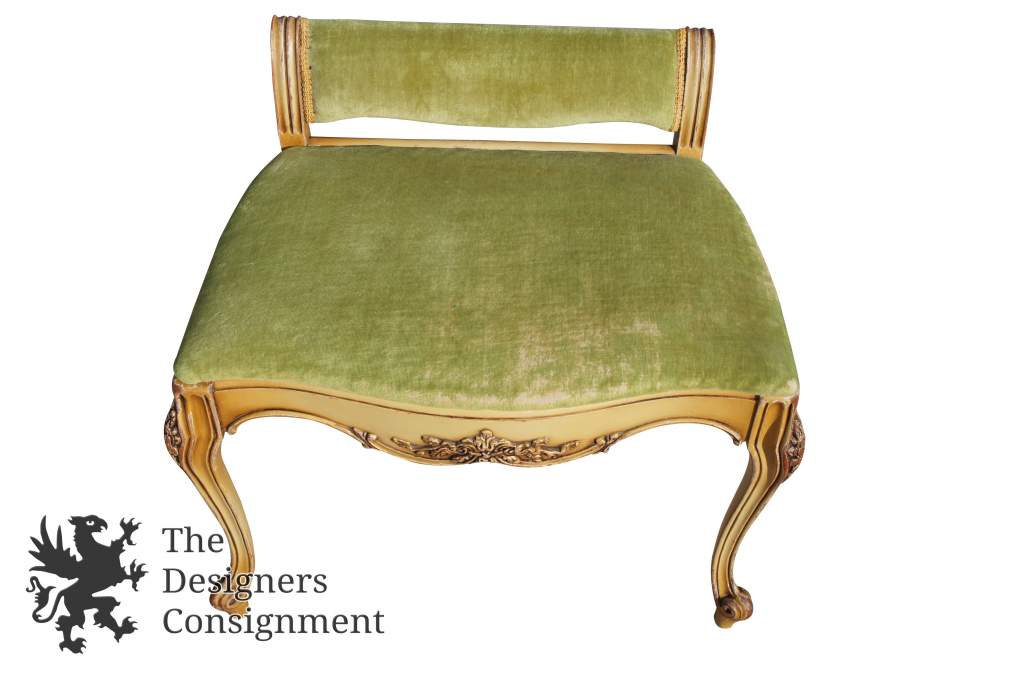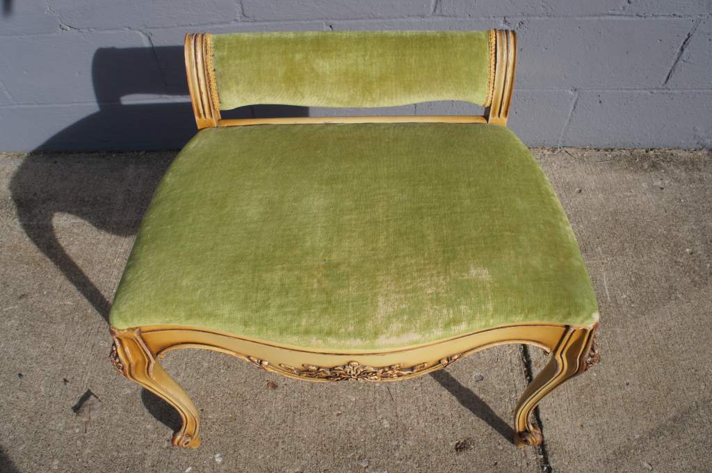 A neat little vanity bench. Made by The Fridman Furniture Company out of Cincinnati Ohio. French Provincial style with green seat.