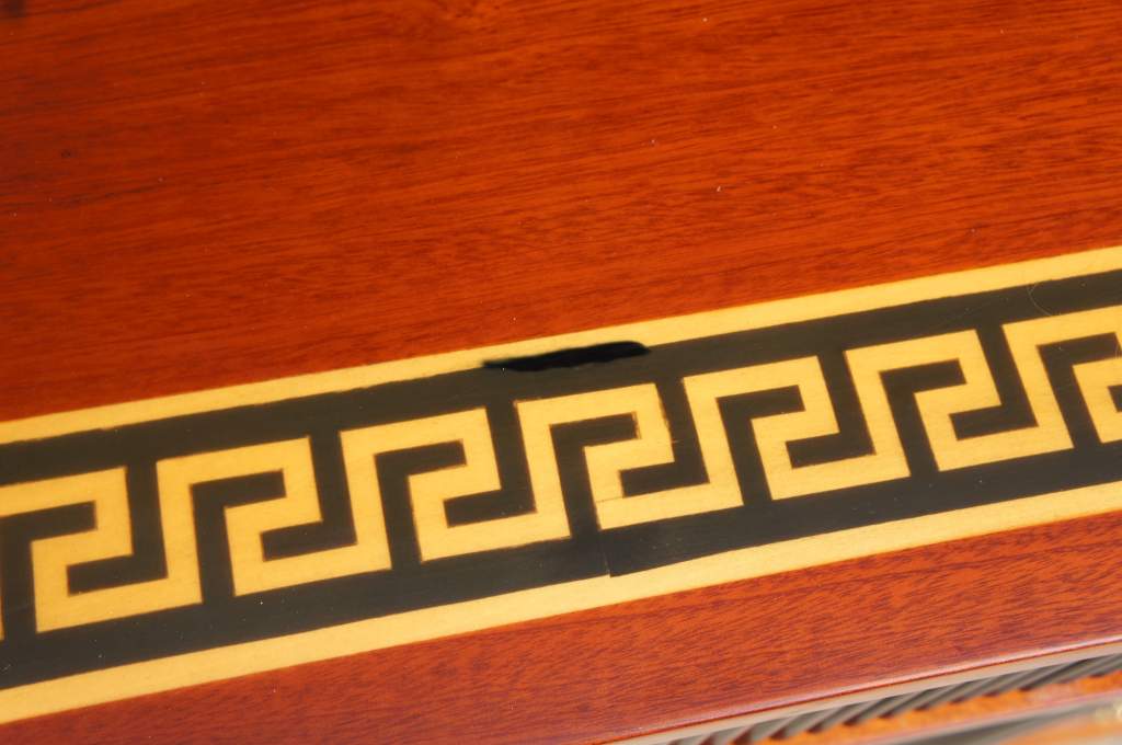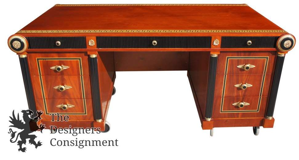 A magnificent 77" Executive desk. Made from Mahoganywith flamed panels, brass accents and black trim. The top features a Greek Key inlay. Matching chair available if interested/