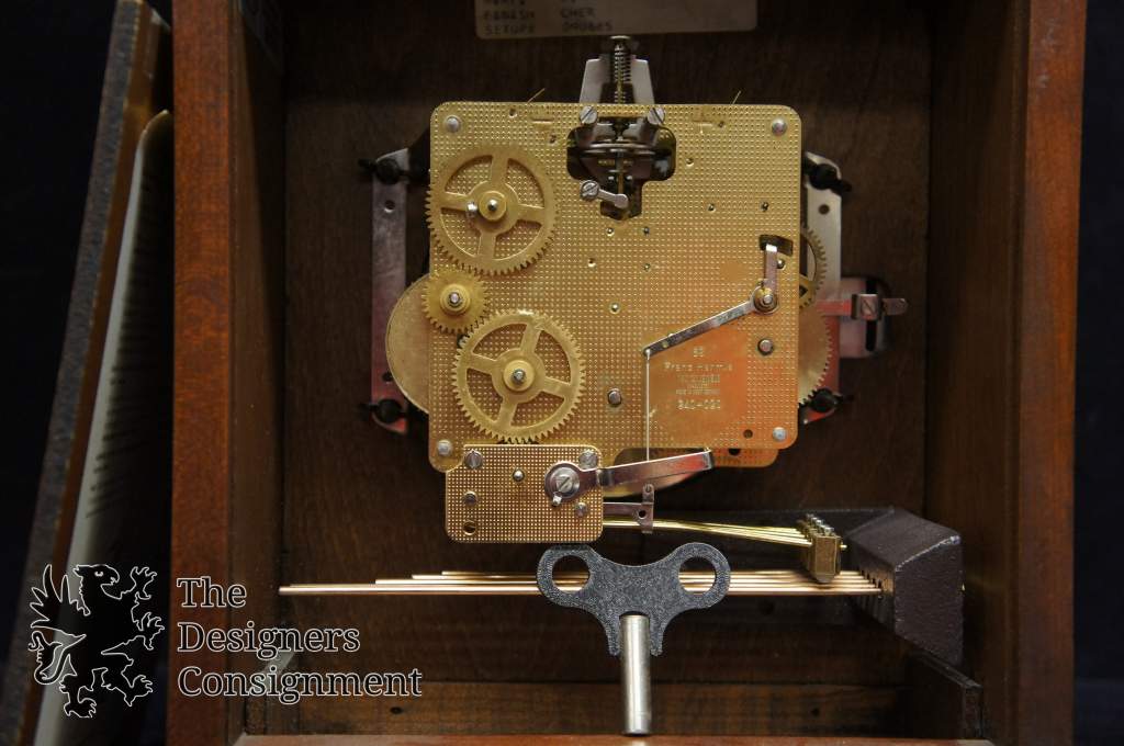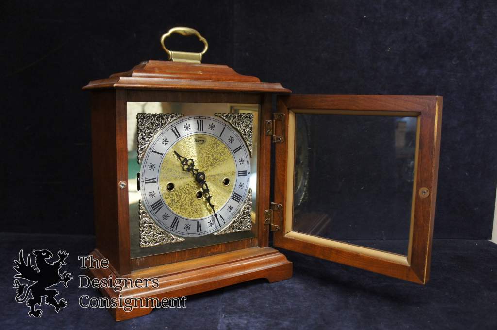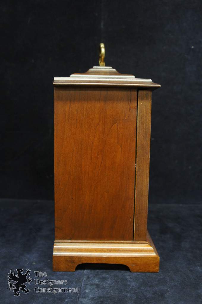 A beautiful clock Carriage style mantel clock by Ridgeway. Finished in Cherry with Franz Hermle 2 Jewel Works. The clock is a Triple Chime with swinging door magnetic door. The face is gold and silver toned with black roman numerals.
