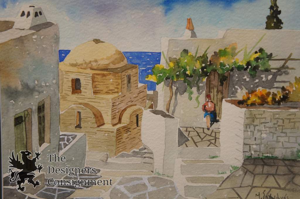 Greek Artist Signed Watercolor Painting Cityscape Village Impressionist Framed