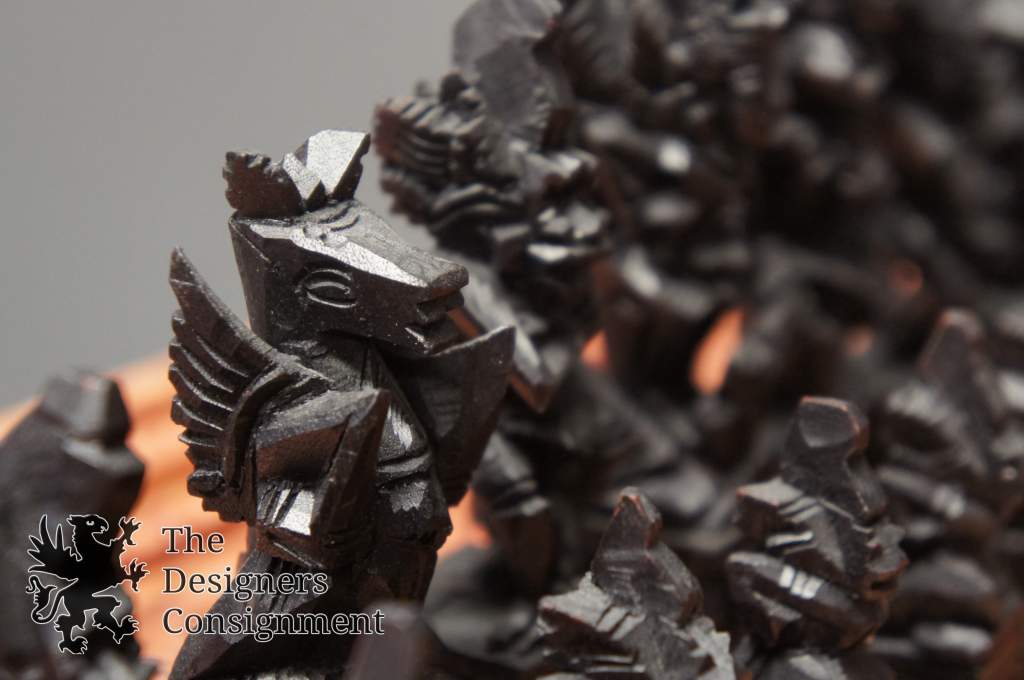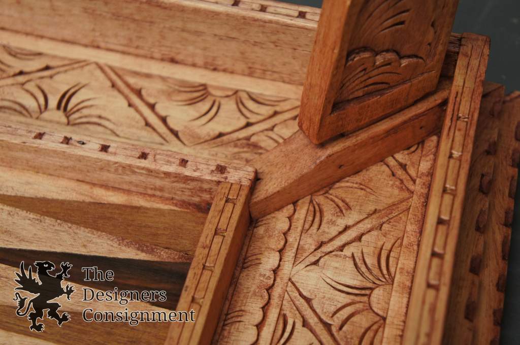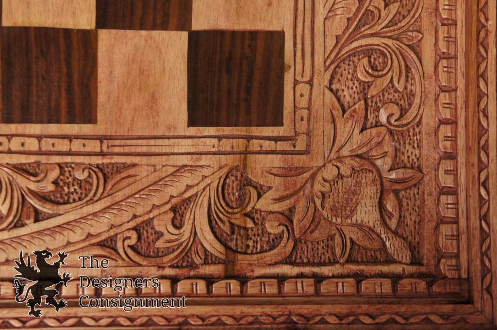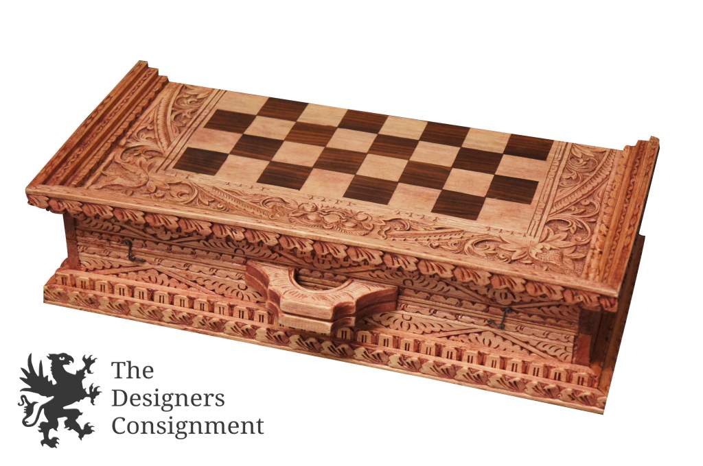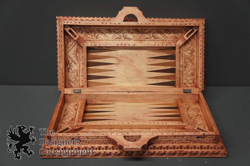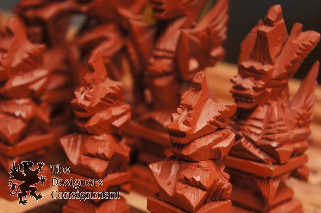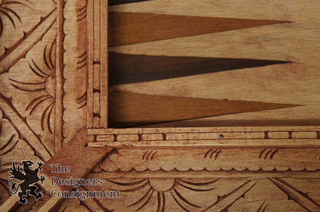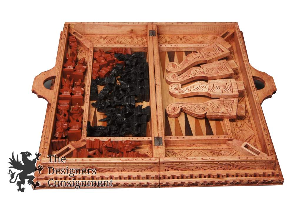 An amazing hand crafted chess and backgammon set. The entire set is intricately carved from wood with exquisite attention to detail. The chess set has detachable legs allowing it to be elevated on the floor or playing surface. The playing pieces are Indonesianin style and reminiscentof Totems. Backgammon pieces are not included, but easily found online.