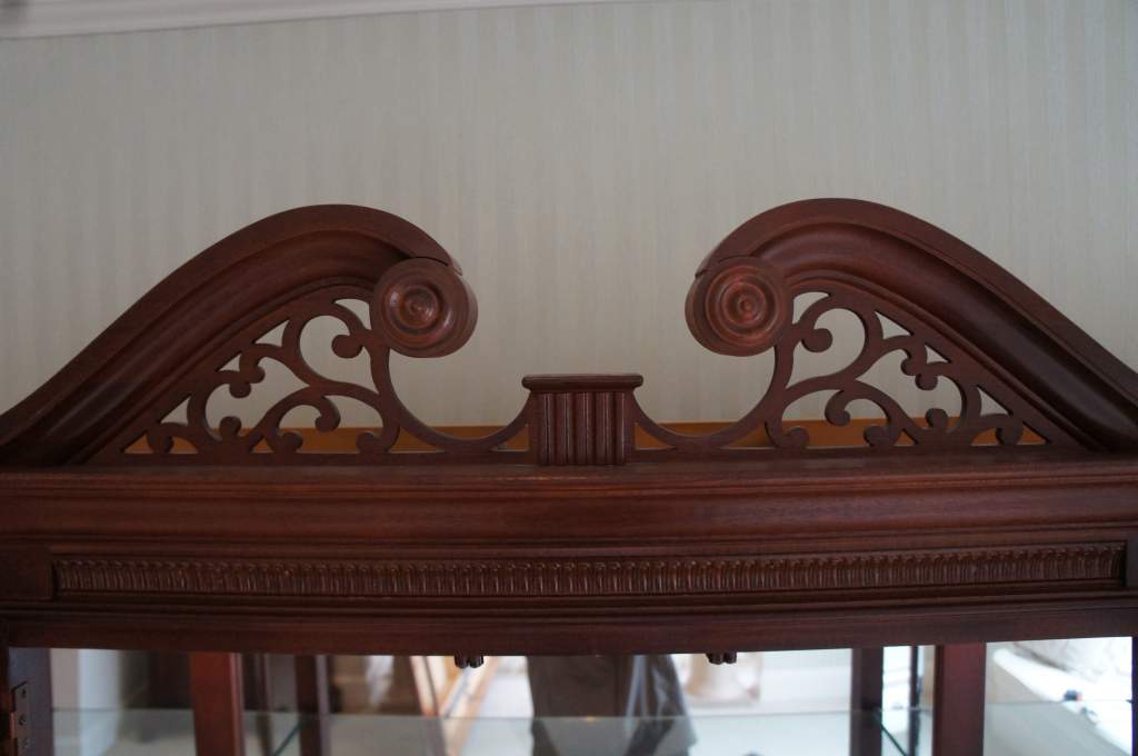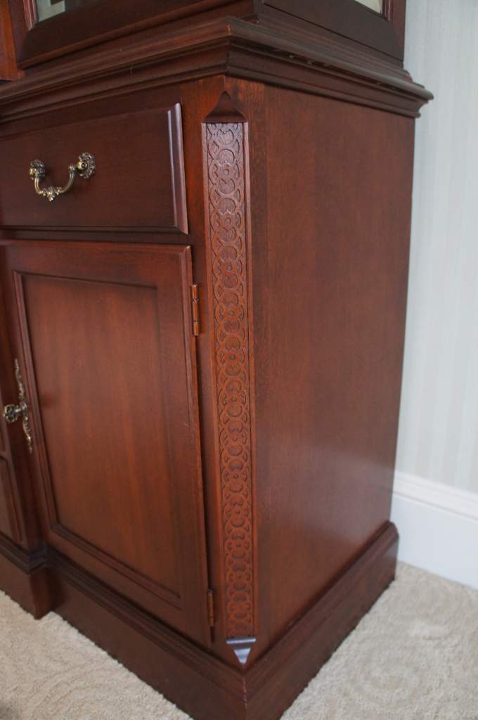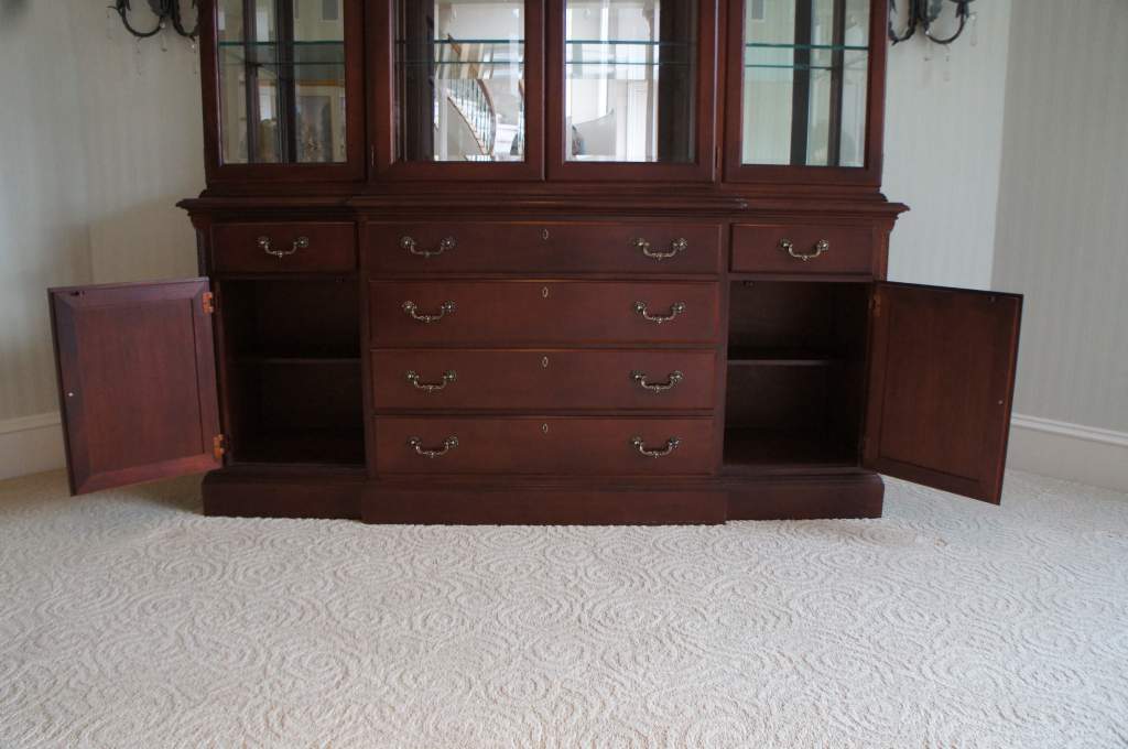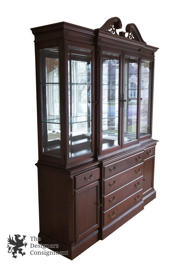 An exquisite piece of Chippendale style furniture from Stanley's 60th Anniversary Stoneleigh Collection. Made from Mahoganywith intricatelycarved accents. The breakfront is illuminated with glass shelving. Top drawer is lined with silverware cloth. Matching dining room suite available if interested.