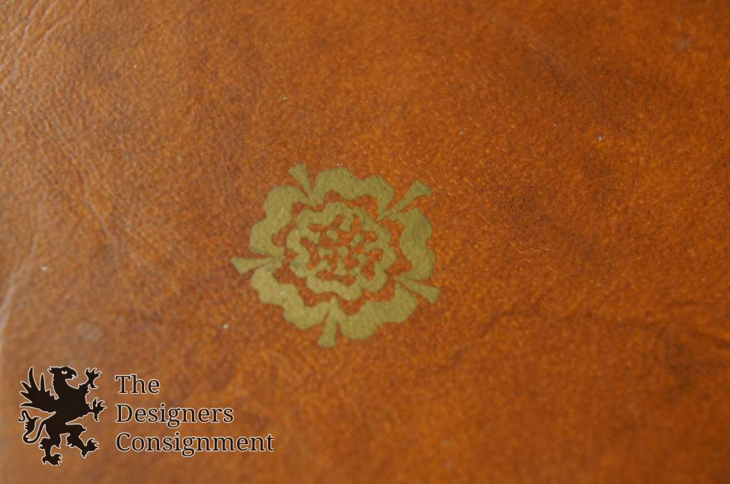 A neat Sheraton style Mahogany Accent Table. Features a leather top with gold accents.
