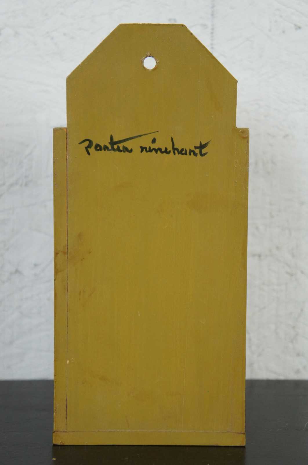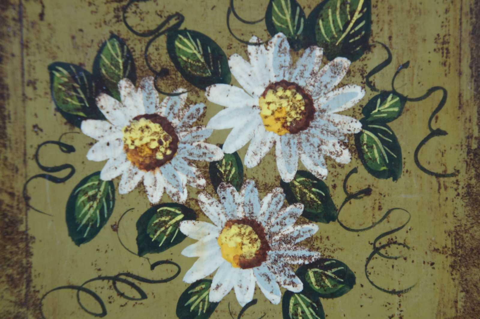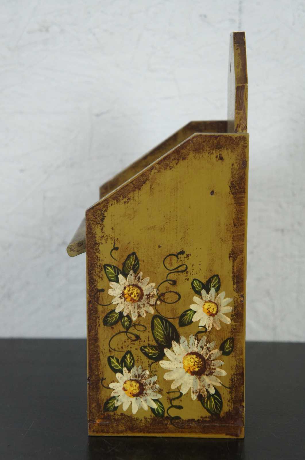 Vintage wall hanging folk art painted lidded box by Porter Rinehart, yellow with white daisies. An accomplished artist that had worked in all mediums, H. Porter Rinehart was a recognized artist known best for his tole paintings. In his later years, he studied with and worked for Peter Ompir. He died in 1987.