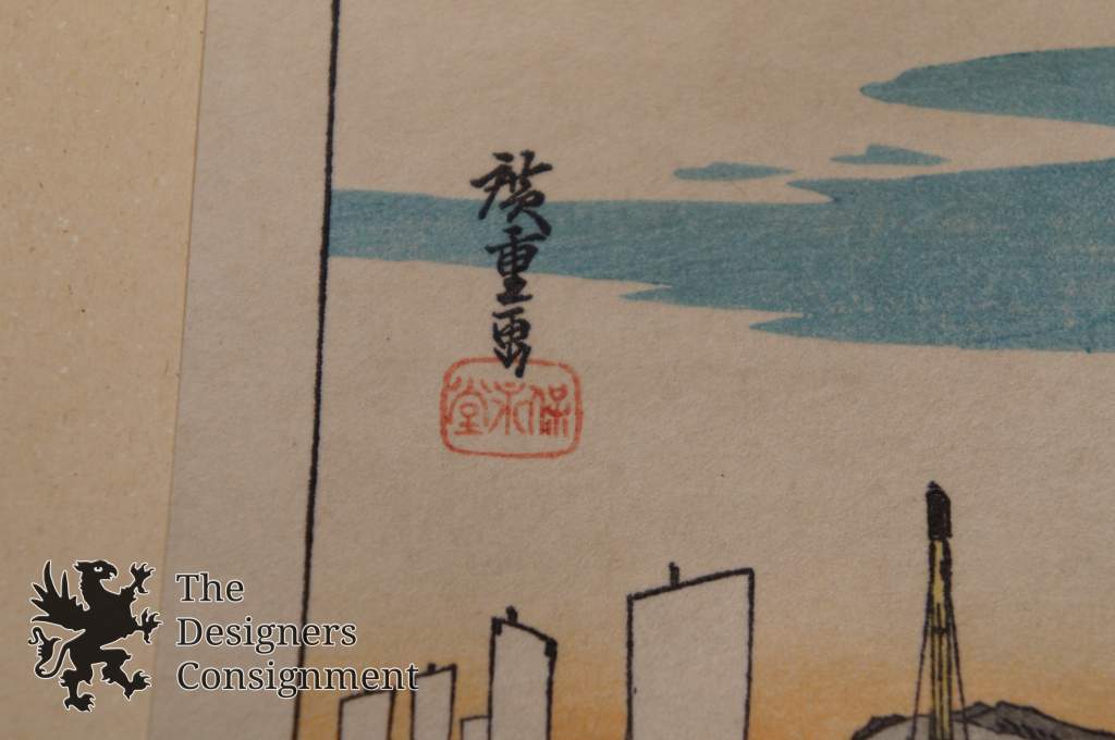 In the early 1830's, he started to discover himself as an artist, starting on the landscapes which became his forte, and changing his signature to Ichiyusai (sometimes Ichiryusai). His first landscape series was in 1829 or 1830, entitled Eight Famous Views of Omi, followed by a ten-print series Famous Places of the Eastern Capital, which in addition to showing the influence of Hokusai, also marked the first revelations of Hiroshige's true genius.