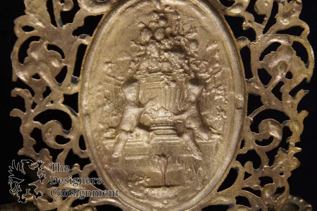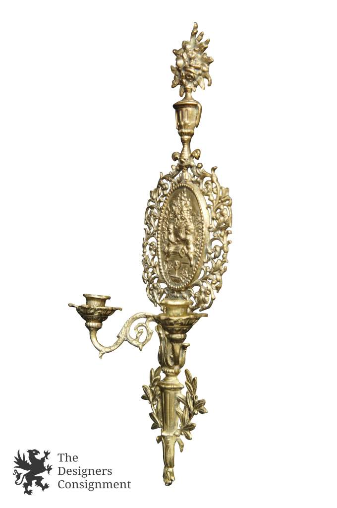 A lovely brass wall sconce with a Victorian scene. Features french stylingthroughout.