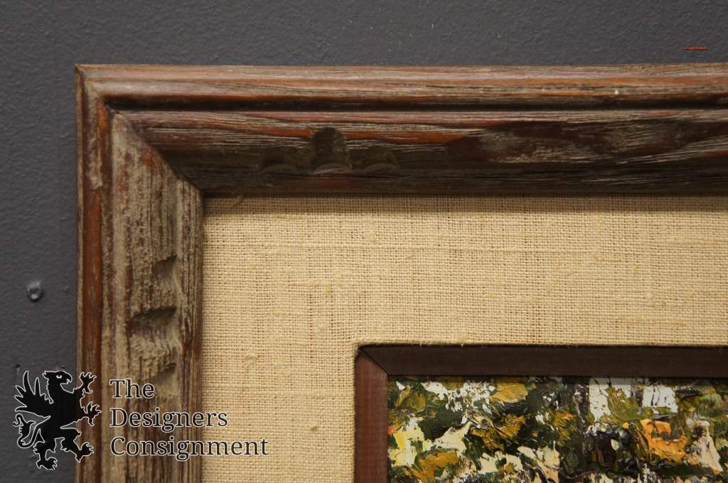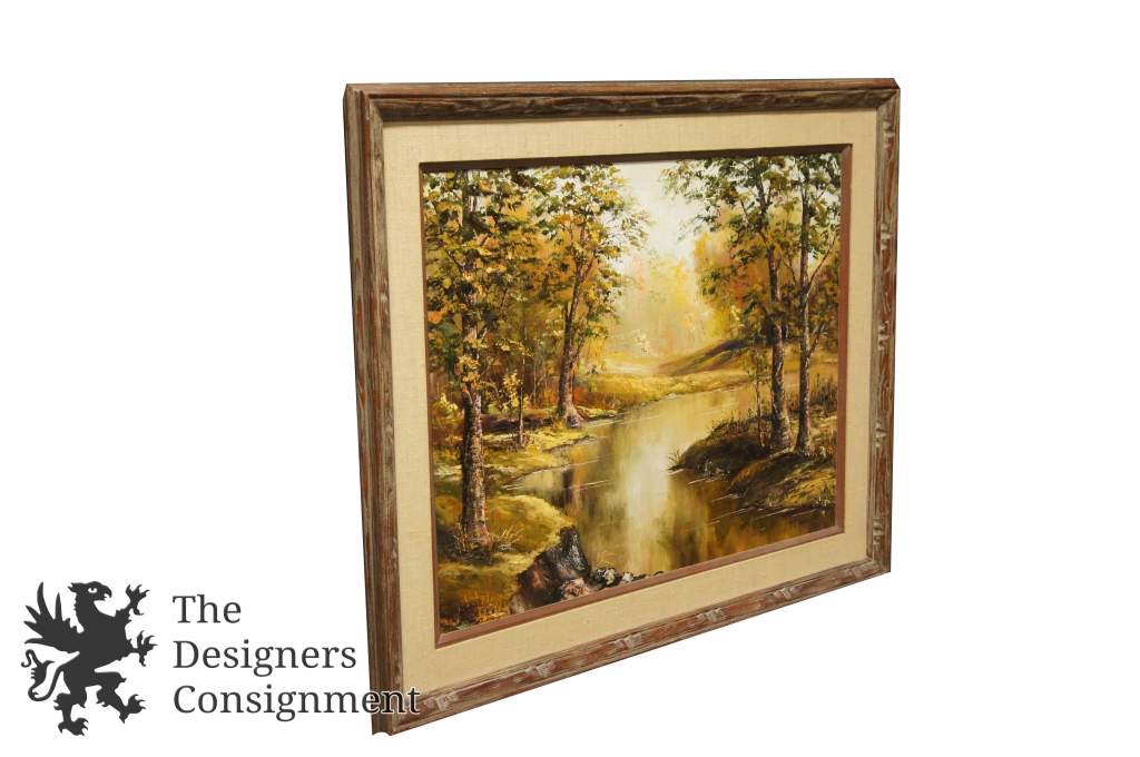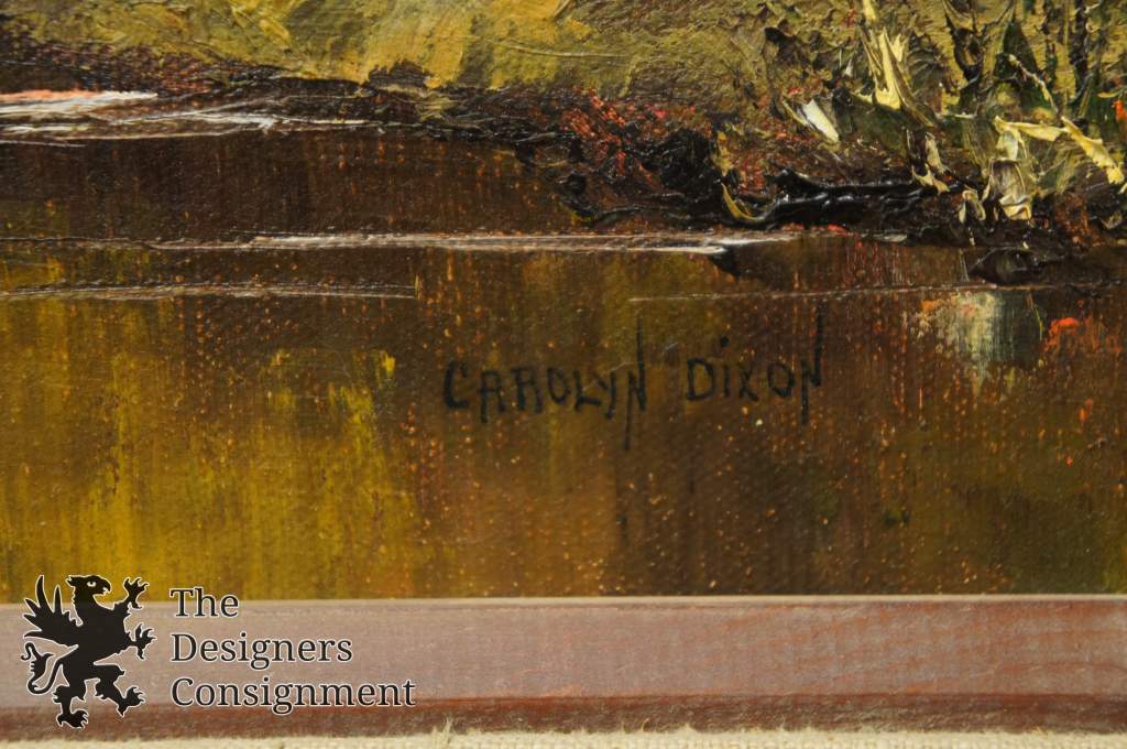 Ohio artist Carolyn Dixon (Grove City, Ohio, 20th century). Dixon is primarily known for her central and southern Ohio landscape scenes. This piece shows a beautiful gaze into the woods over a river. It is signed along the bottom right portion.