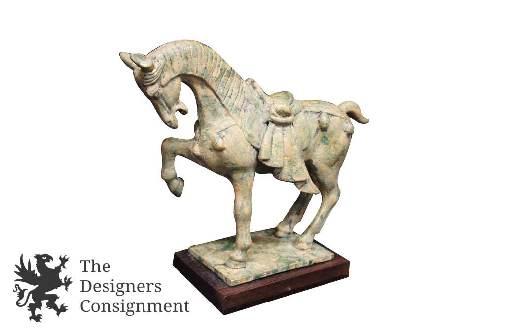 Mid 20th Century Tang Dynasty style Horse Figure. Made from Cast bronze with lovely patina. Comes with wooden stand. Marked Japan along the base.