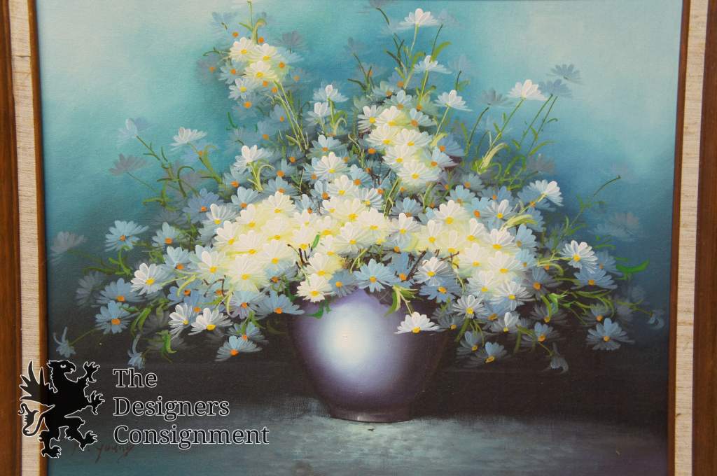 A beautiful still life by what appears to be a Karen Young work. Karen is an eastern inspired artist. The piece features a purple ceramic pot full off elegant daises on a blue background.