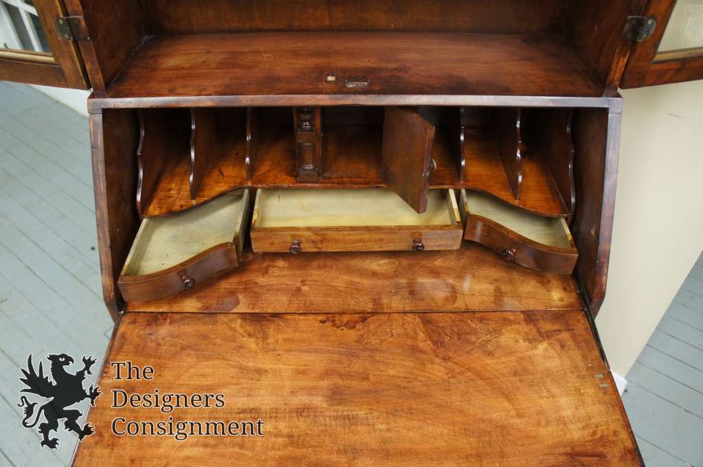 A lovely secretary desk with bookcase. Features an open pediment top, oxbow front and ball & claw feet. Bookcase features 2 fixed shelves. Slant top opens to reveal writing surface, 3 drawers and pigeon holes for storage. A great addition to any setting.