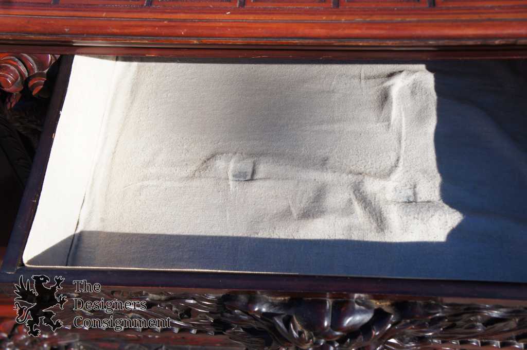 Impressive Japanese Export Art Nouveau Sideboard. Meiji Period c.1880-1912. Meticulously carved from rosewood with high relief detail. At the center is an open space for display and storage. The drawer can be seen above with the face of a dragon flanked by two cabinets framed in floral carving. There are six figural carved dragons along the face and side of the cabinet. Each is shown in full scope with scrolling detail. In Japanese culture these dragons are considered guardians; a symbol of strength, ferocity and wealth. This theme is continued into the back-splash, which is the most monumental addition to this piece spanning its entire width. Here two dragons are seen scrolling through the clouds as they meet facing each other at the center. The top surface is smooth for serving with a Greek key trim. Lower apron is finished with three additional dragon faces amongst a floral motif. The six feet are five toed and surrounded by cloud carvings. The dragon which is the defender of Buddha and Buddhism makes an elaborate and clear mark on this sideboard. A one of a kind piece that will have an amazing presence in any setting.
