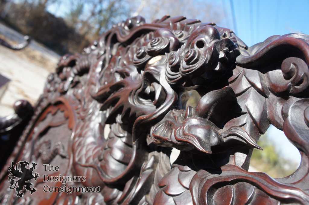 Exquisite 1920s Chinese import dragon bench. Made from Rosewood with high relief carved accents. From top to bottom this piece is ordained with dragons. The crown is pierced with a serpentine dragon scrolling through clouds. At the center of the lower back are two more dragons set within panels facing each other. A similar theme is continued throughout the piece. Winged dragons are set at the corners of the base offset by a face along the apron between. Arms are exceptionally detailed with scales and wings. Here the dragon is seen with a ball in his mouth. The arms and dragon along the crown each have bovine inlaid eyes. A testament to the exceptional craftsmanship. An Impressive overall design that will look great in any setting.