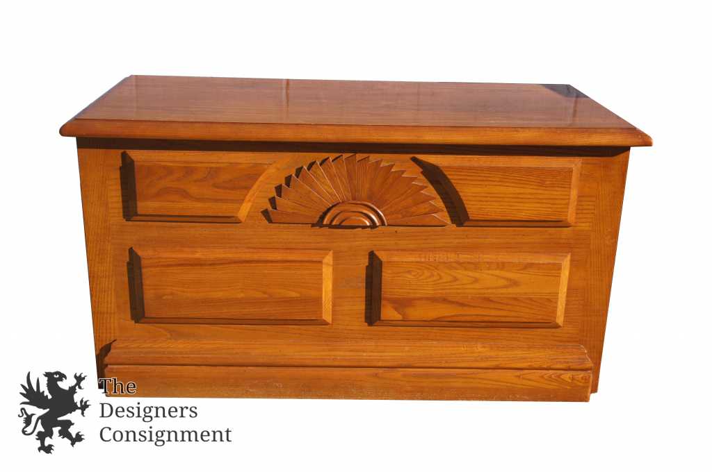 A lovely Ashwood chest made by Stanley Furniture Company. Features a hinged lid and sunburst design along the front. The perfect bedside addition to any space.