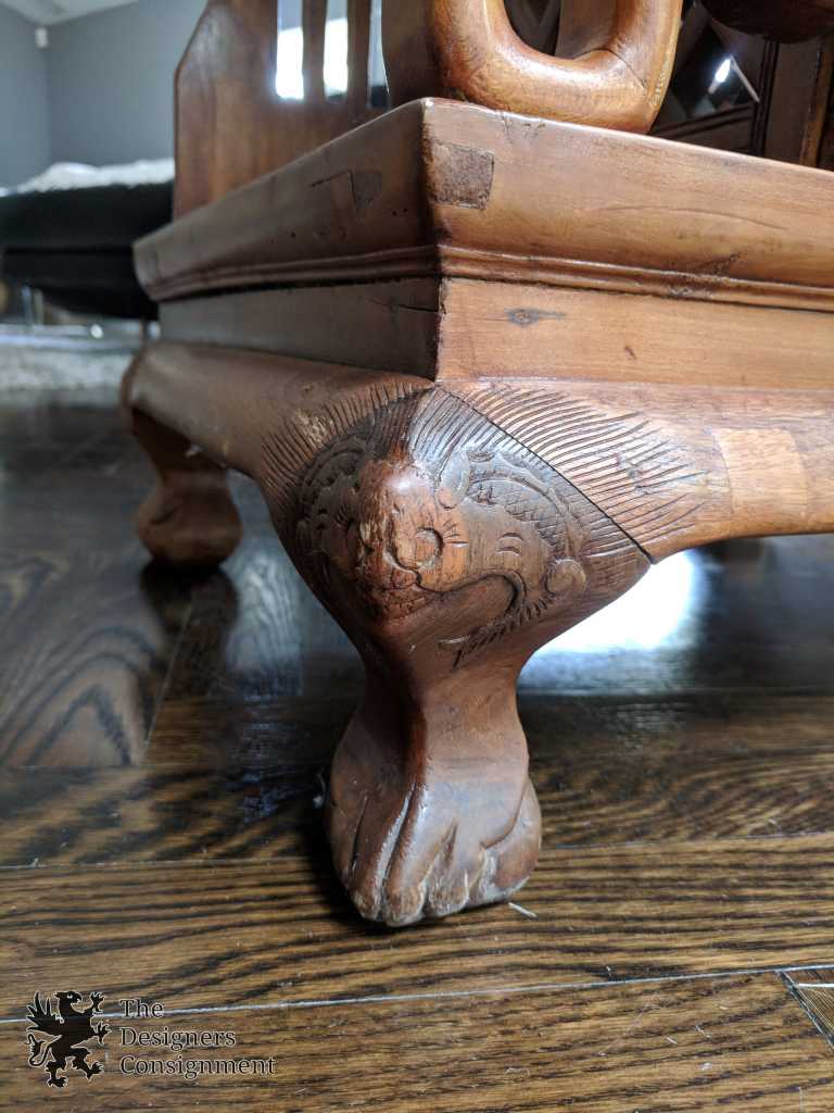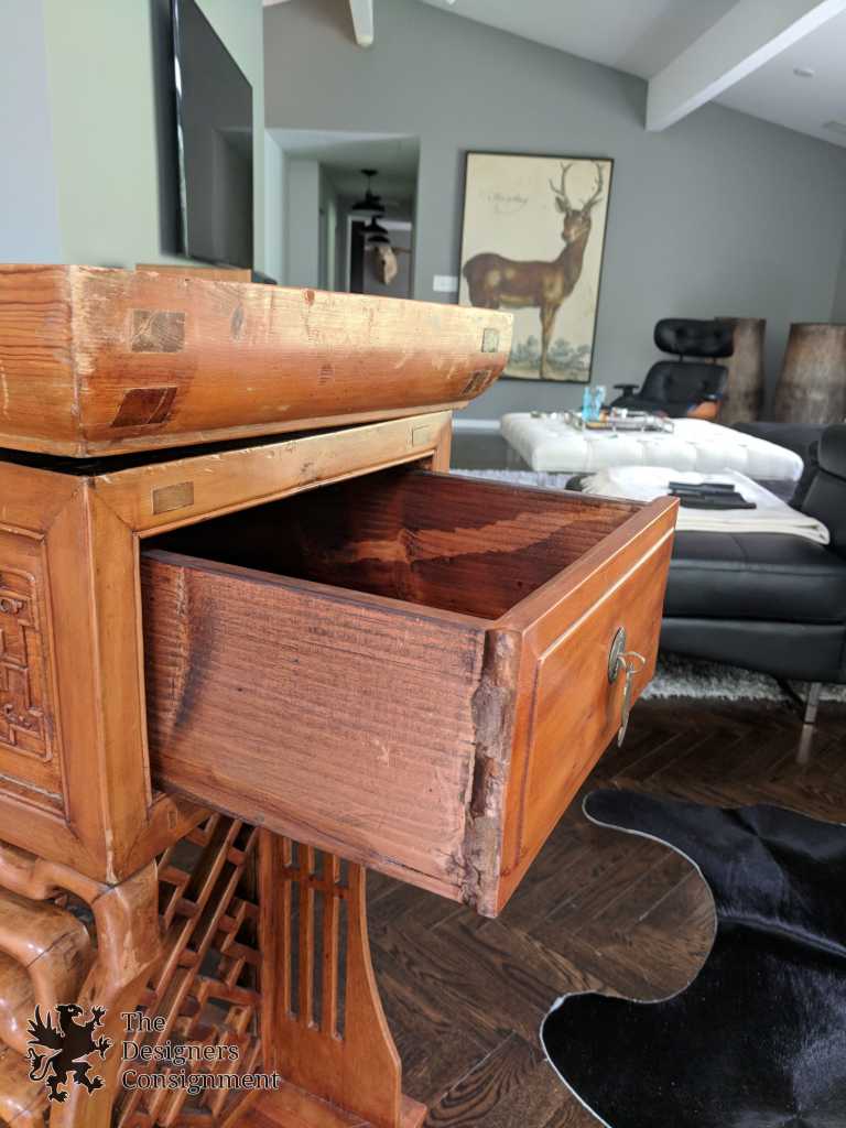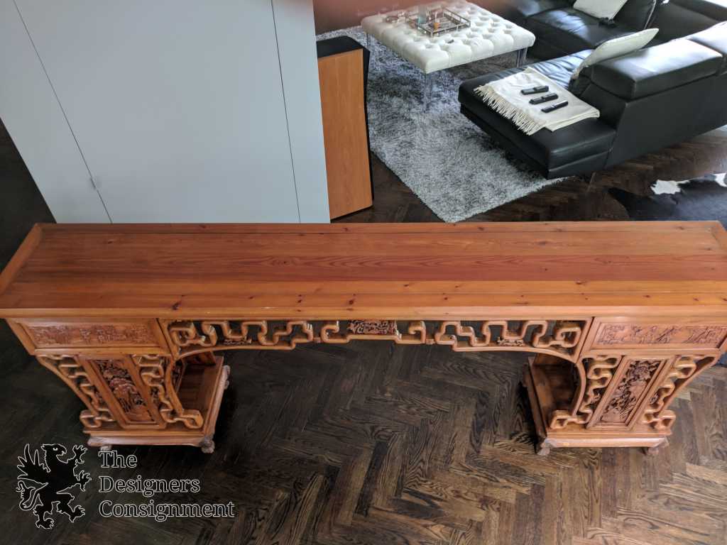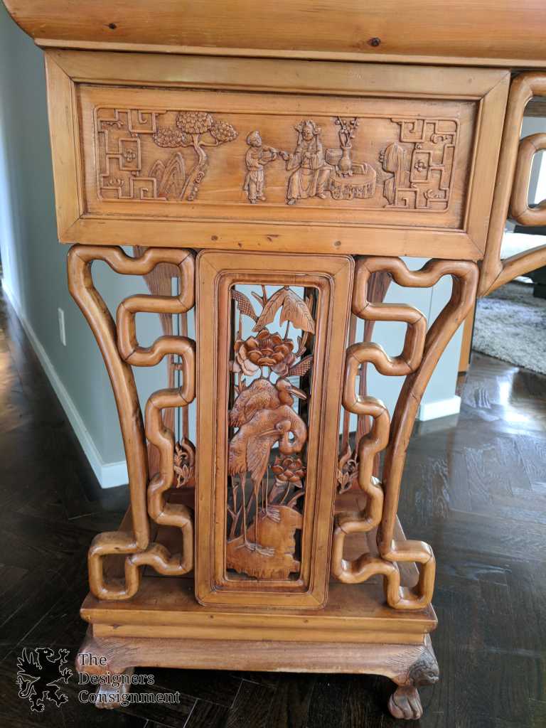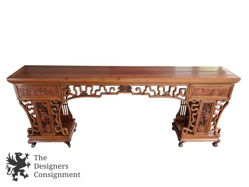 Up for consideration is a meticulously detailed Chinese console table. Circa 1850-1899, Qing Dynasty. Made from Elm with dovetailed construction. The elongated table with drawer on each side breaks down into 4 pieces for ease of moment. Features a pierced and scrolled front with with landscape carved scenes with villagers and cranes. At the very center a squirrel can be scene amongst berries and nuts. The table is supported on each side by 4 paw feet. Along the side there's an open geometric design allowing one to see the intricacies of the painstaking craftsmanship. An amazing oerall piece that will make a great addition to any setting.