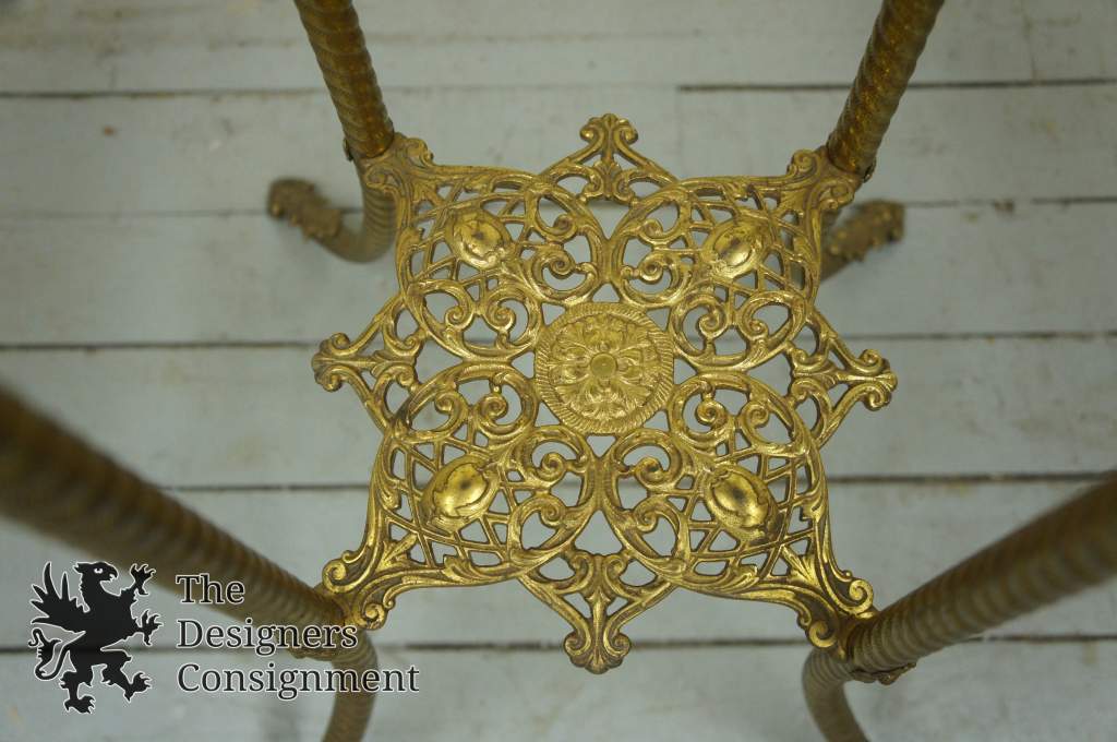 Beautiful Early 20th Century Brass plant stand. 2tierwith Onyx insert along the top. Table features twisted legs, acanthus feet and filigree accents throughout. Very similar to Bradley & Hubbard's work.