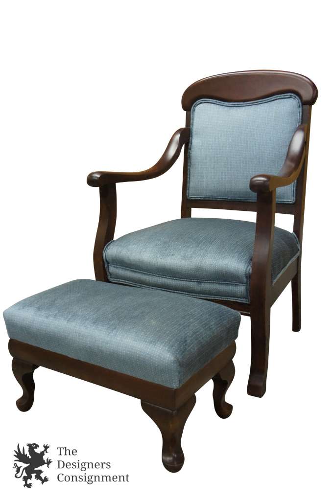 Early 20th Century Mahogany Gentleman's Chair, upholstered in a light blue with matching ottoman. Ottoman tops lips off revealing a secret compartment. Features a mix of Victorian and Queen Anne styling. Sleek lines with a smooth finish. Parlor set available and pictured below. This includes; a rocker, settee, 2 arm chairs and agentlemanchair with ottoman.