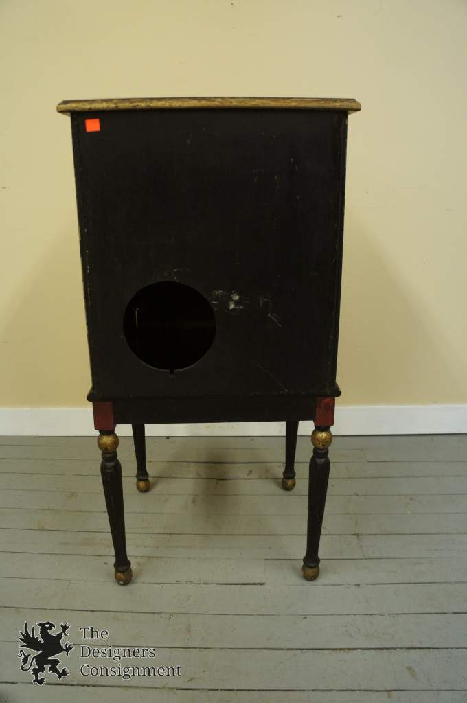 Here we have a unique black and red cabinet painted with Japanese Motifs and accented with gold trim. Along the front is a geisha seen by a tree with geisha in the background. The side and top also feature geishaseenwith cherryblossomtree. This cabinet or chest could be used for music ormiscellaneous. Could also be converted into a humidor with little effort. A great addition to any setting.