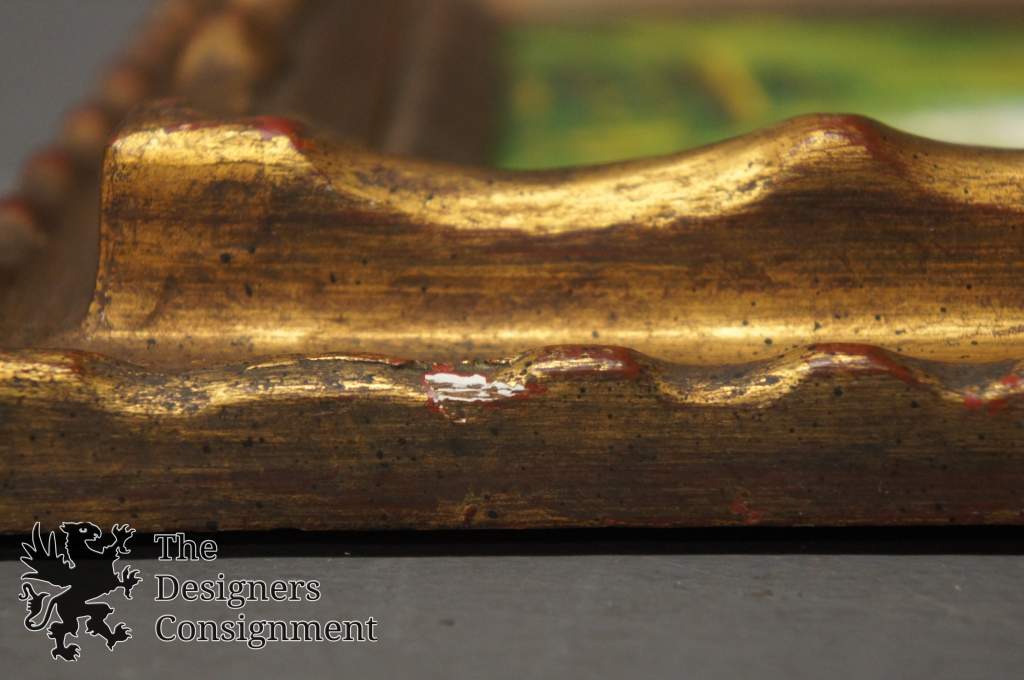 Featured is a signed oil canvas. A trail can be seen through the woods with mountains off in the distance. Vivid greens in a nice frame.