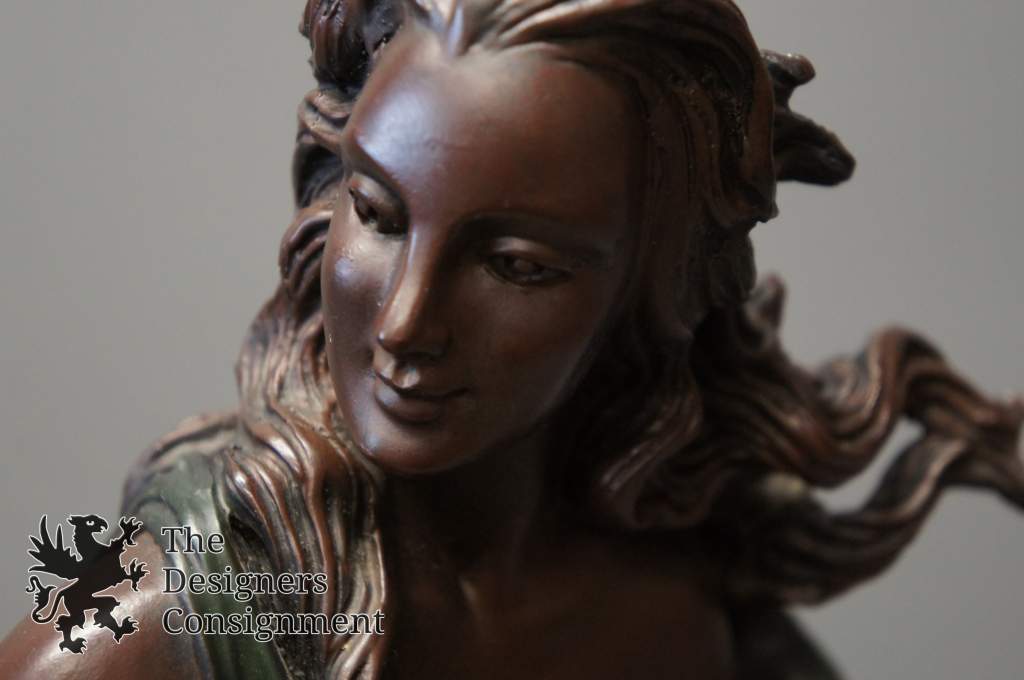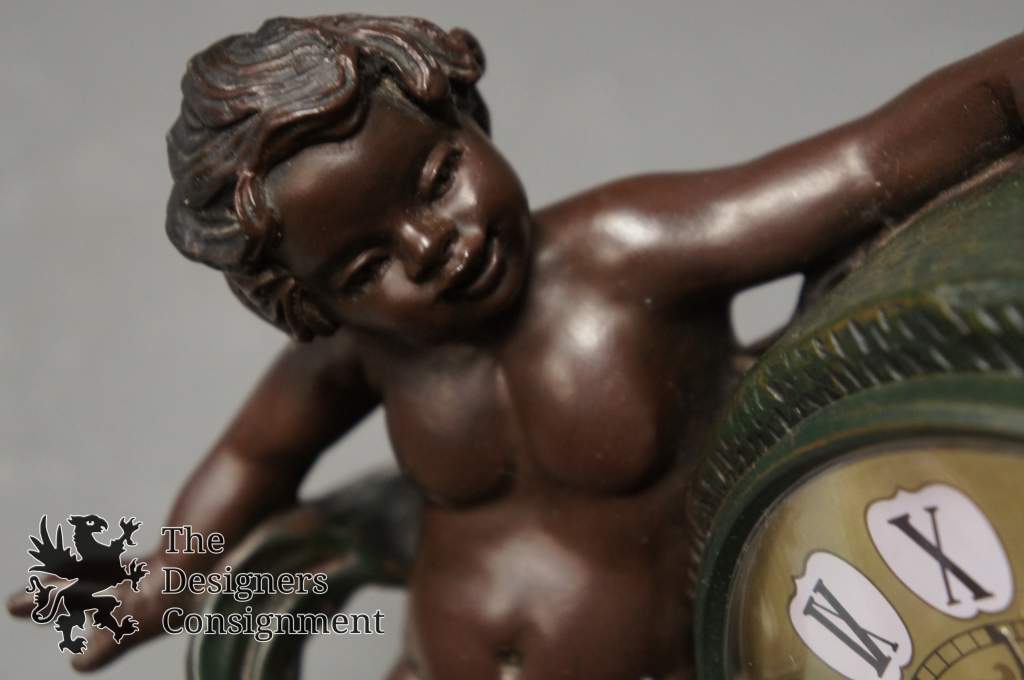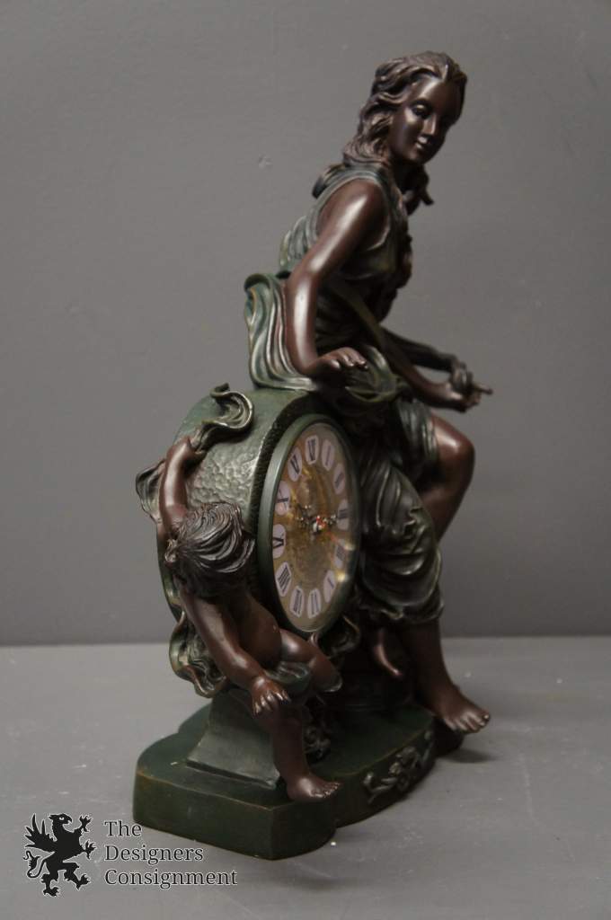 A nice reproduction Victorian Style Mantel Clock. Features a cherub hanging off the left, countered by a Greek Goddess along the right. The clock is Quartz, with Roman Numerals. Battery Powered.
